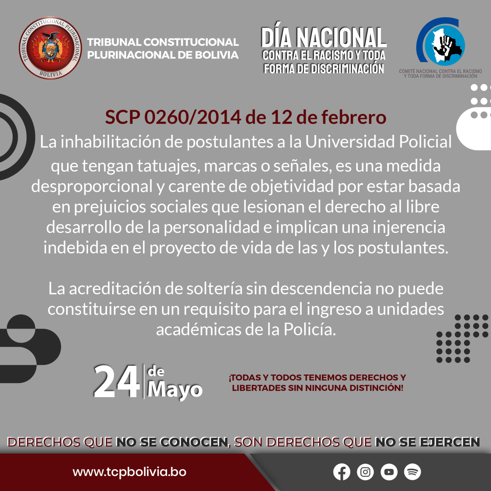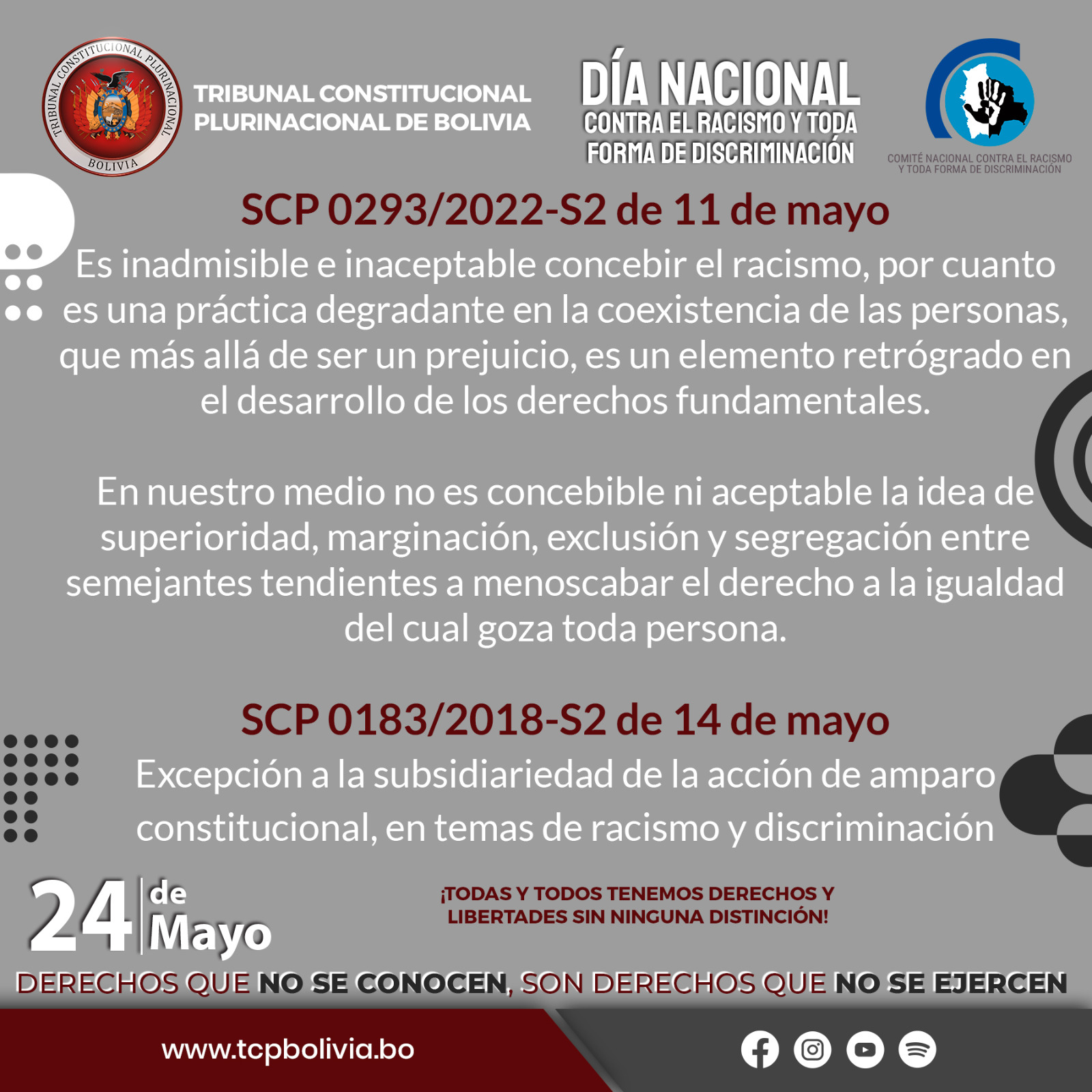 En el “Día Nacional Contra el Racismo y Todo Forma de Discriminación”, compartimos las Sentencias Constitucionales Plurinacionales emitidas por el Tribunal Constitucional Plurinacional de Bolivia – TCP que resguardan los derechos de las personas, promueven el respeto, la tolerancia, la prevención y la lucha contra el racismo y discriminación.