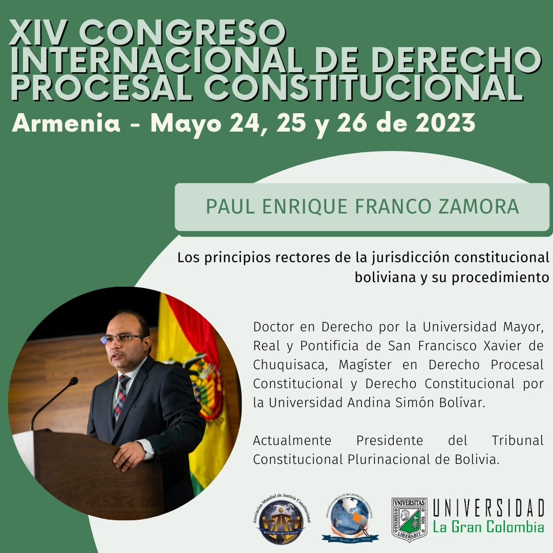 A invitación de la Universidad La Gran Colombia, de la Asociación Colombiana de Derecho Procesal Constitucional y de la Asociación Mundial de Justicia Constitucional, el Presidente del Tribunal Constitucional Plurinacional, Ph.D. Paul Enrique Franco Zamora, en representación del país, presentó de forma virtual la ponencia: «Los principios rectores de la jurisdicción constitucional boliviana y su procedimiento», en el XIV Congreso Internacional de Derecho Procesal Constitucional que se desarrolla los días 24, 25 y 26 de mayo en la ciudad de Armenia.