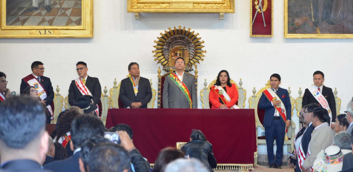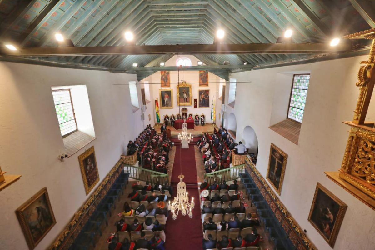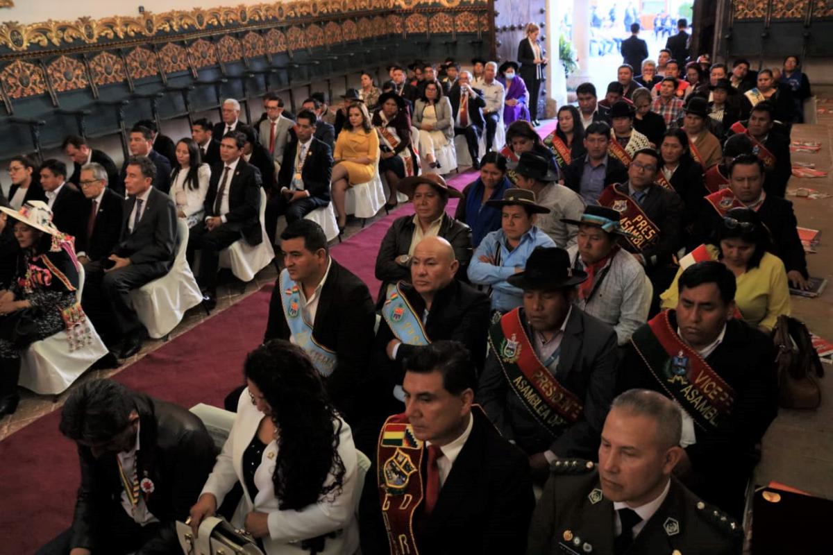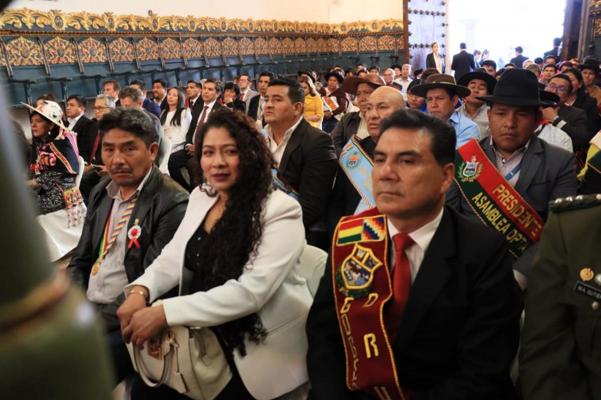 La solemne sesión desarrollada en la histórica Casa de la Libertad en la víspera del aniversario de Chuquisaca, contó con la presencia de los primeros mandatarios del país, autoridades del Órgano Ejecutivo, Legislativo, Judicial, Electoral, de los Gobiernos Departamentales, Municipales, Embajadores, Alto Mando Militar, Policial, Organizaciones Sociales e invitados especiales.