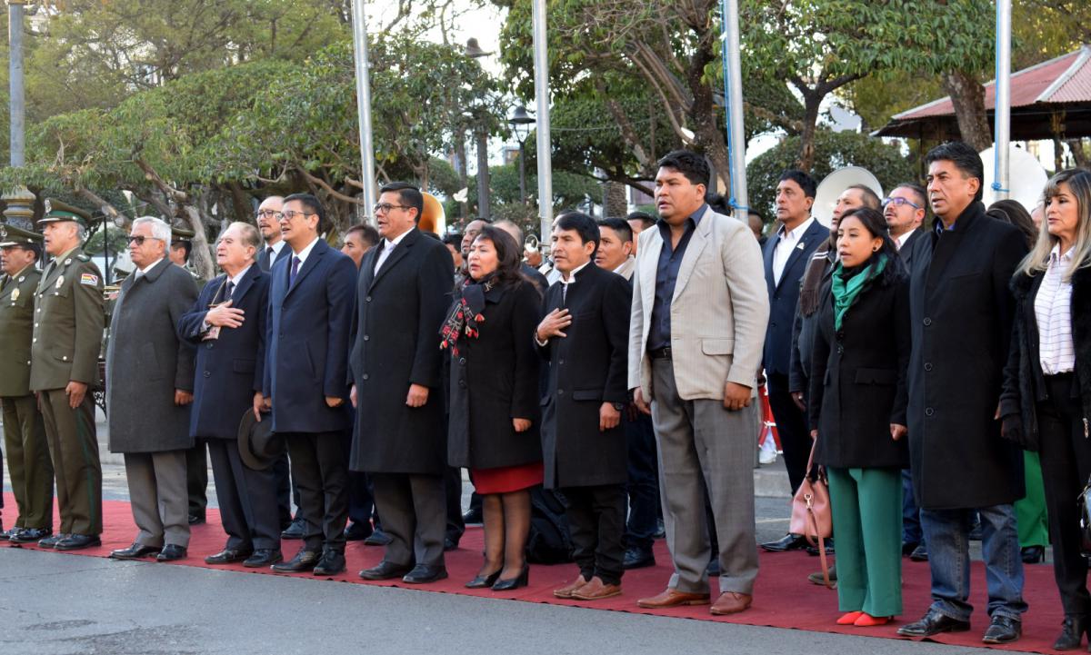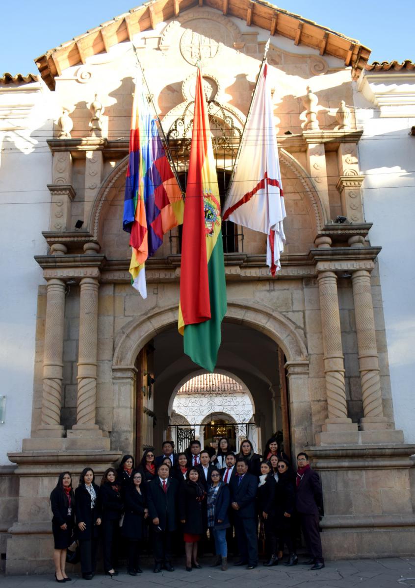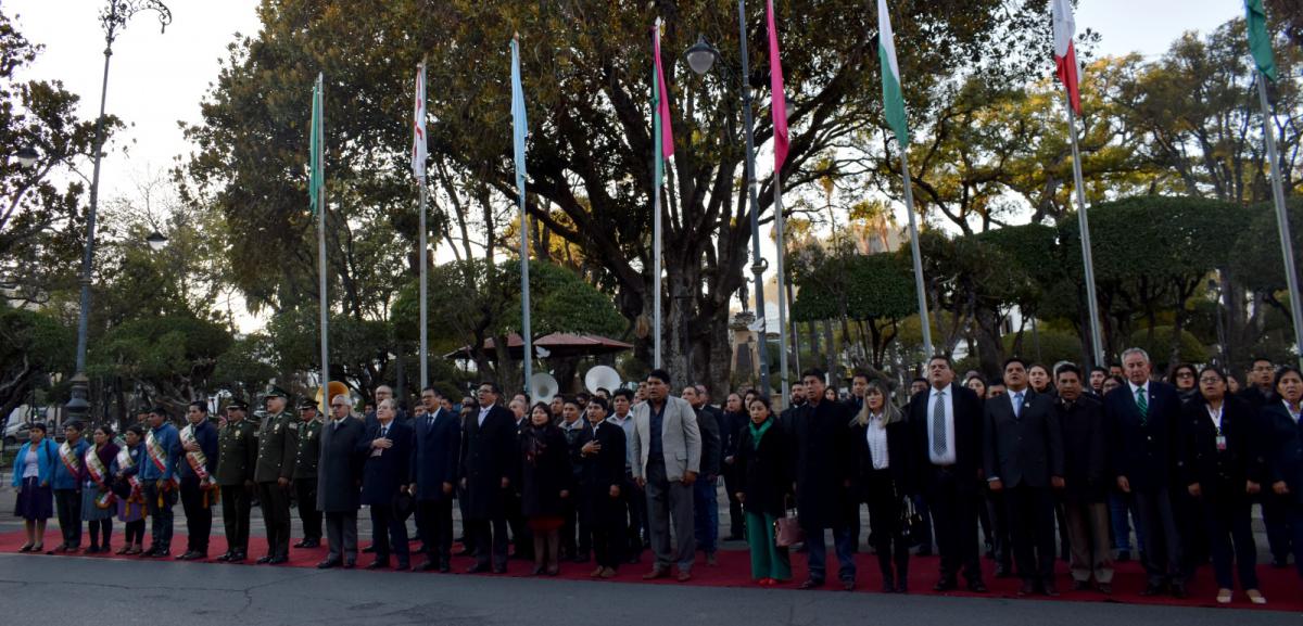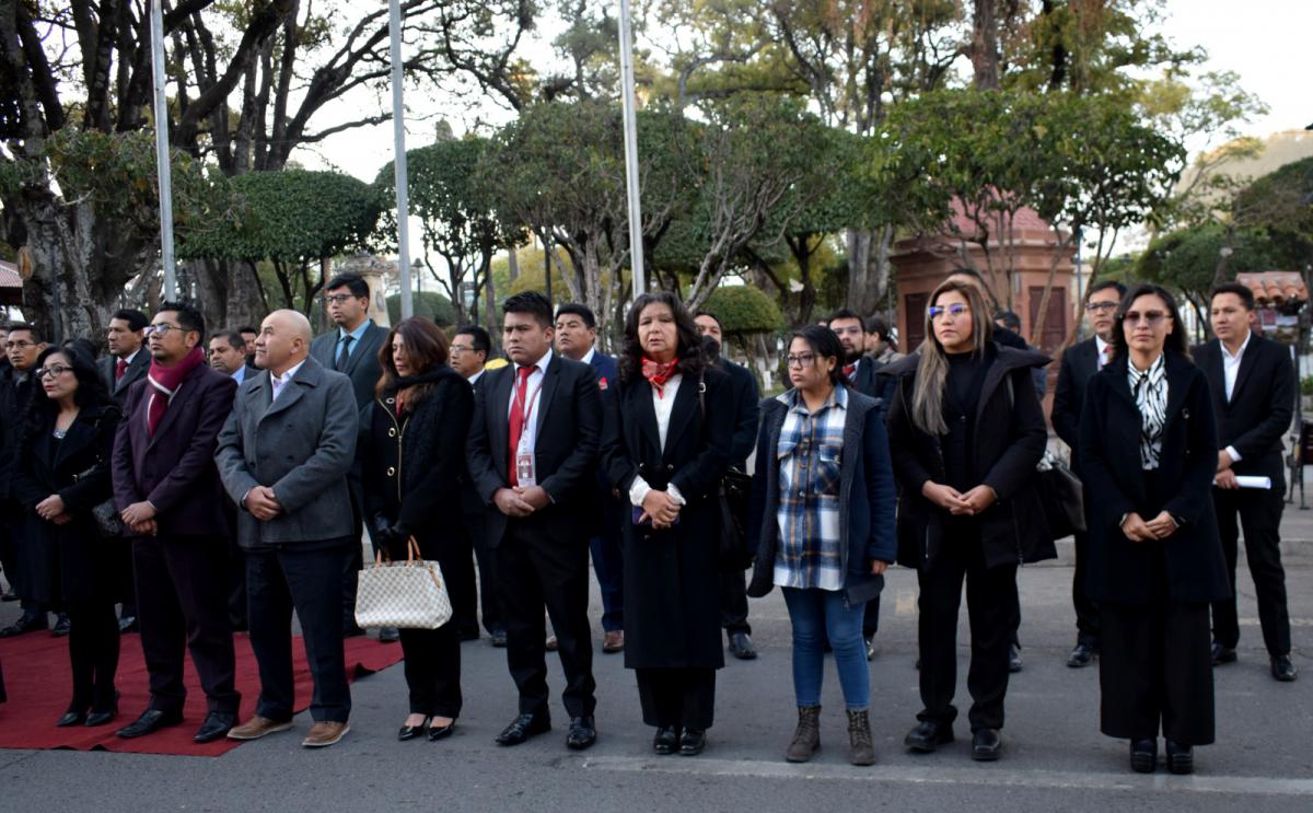 El acto se desarrolló en las puertas de la histórica Casa de la Libertad y contó con la presencia del Gobernador del Departamento de Chuquisaca, Damián Condori Herrera; del Alcalde del Gobierno Autónomo Municipal de Sucre, Dr. Enrique Leaño Palenque; del Alcalde del Gobierno Autónomo Municipal de Presto, Ing. Jaime Roque Castro; de la Diputada Uninominal Suplente, Josefina Maturano Trigo; del Presidente del Consejo Municipal de Presto, Claudio Pucho Yale; del Concejal Municipal de Sucre, Prof. Eduardo Lora Siñani; del Delegado Presidencial del Consejo Nacional del Bicentenario de Bolivia, Dr. Martin Maturano Trigo; del Vicerrector de la Universidad, Mayor Real y Pontificia de San Francisco Xavier de Chuquisaca, Dr. Erick Mita Arancibia; del Rector de la Universidad Andina Simón Bolívar, Dr. José Luis Gutiérrez Sardán; del Comandante Departamental de la Policía de Chuquisaca, Cnl. DESP. Marco A. Gutiérrez Delgadillo; del Subcomandante Departamental de la Policía de Chuquisaca, Cnl. DESP. Bismarck Pereira Molina; del Secretario General y de Coordinación de Gobernabilidad de Chuquisaca, Ing. Santiago Arana Bustillos; de los Secretarios Departamentales, Municipales y personal del despacho de Sala Segunda del TCP.