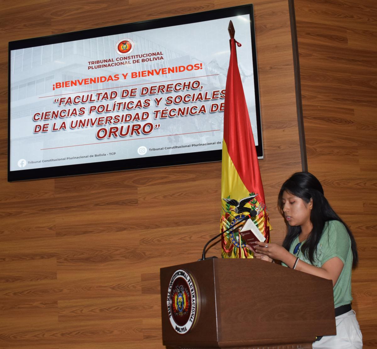 Estudiantes del Segundo Curso de la Carrera de Derecho de la Universidad Técnica de Oruro (UTO), visitaron las instalaciones del Tribunal Constitucional Plurinacional de Bolivia – TCP, donde participaron de un Conversatorio organizado por el despacho de la Magistrada MSc. Georgina Amusquivar Moller, autoridad electa por ese departamento.
