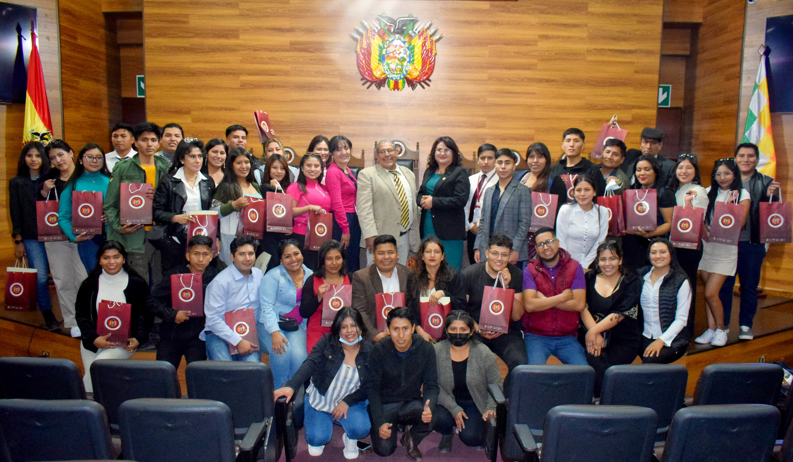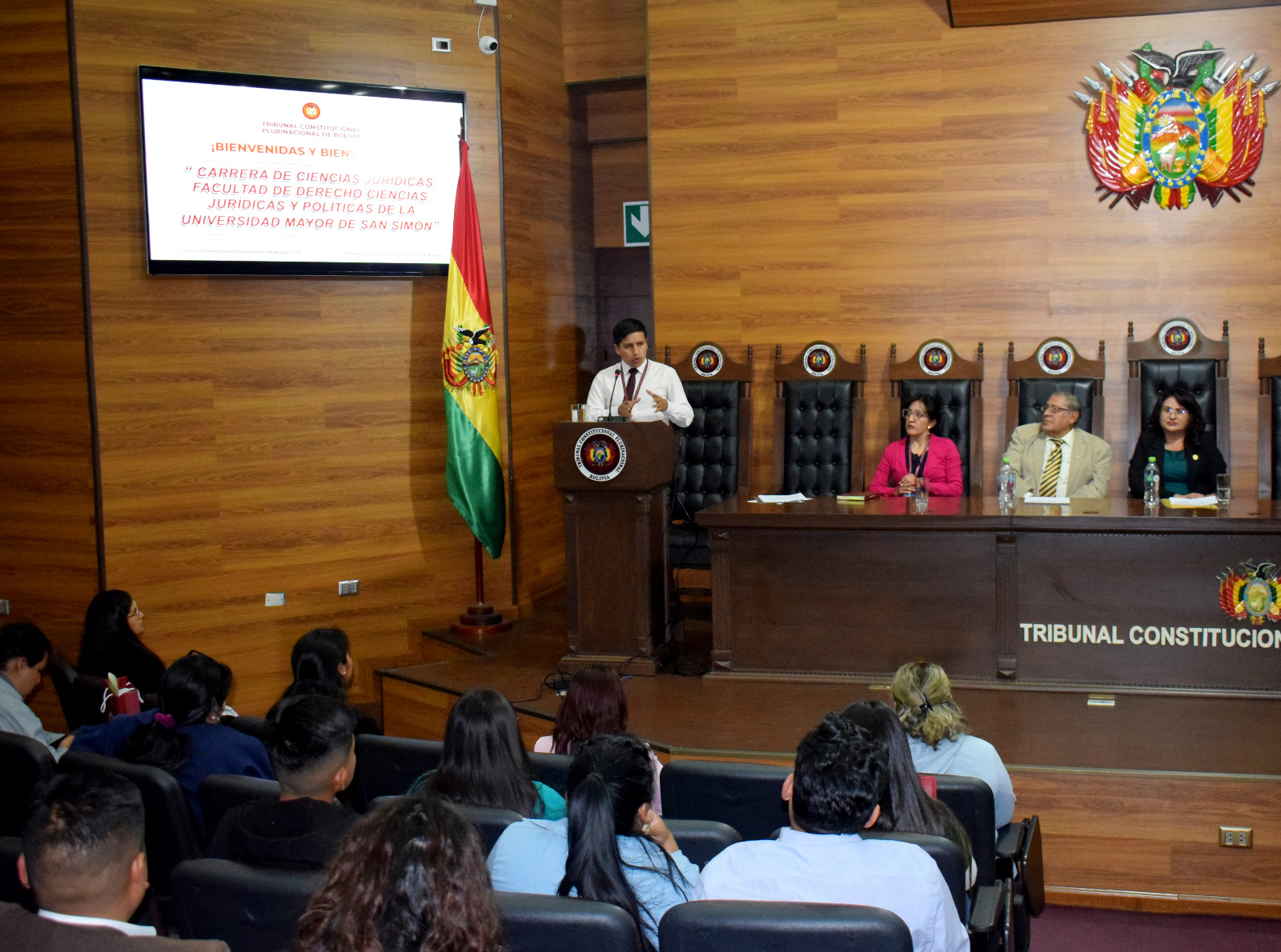 En el marco de la actividad académica programada por la Carrera de Ciencias Jurídicas de la Universidad Mayor de San Simón, una delegación de 40 estudiantes visitó el Tribunal Constitucional Plurinacional de Bolivia – TCP, donde fueron recibidos por la Magistrada electa por el departamento de Cochabamba, Msc. Karem Lorena Gallardo Sejas.