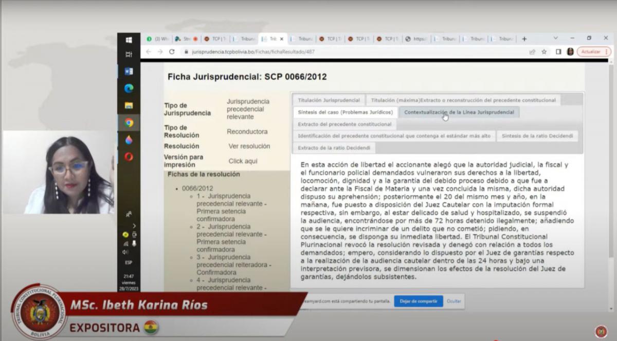 En homenaje al Día del Juez Boliviano, el Tribunal Constitucional Plurinacional de Bolivia – TCP realizó el Curso: “Nociones Sobre Jurisprudencia”, con la finalidad de fortalecer los conocimientos de la comunidad jurídica respecto a los elementos del Derecho Jurisprudencial y los medios de acceso, sistematización y uniformización de las Sentencias Constitucionales Plurinacionales emitidas por la Entidad, a través del “Buscador de Causas y Resoluciones” de su página web.
