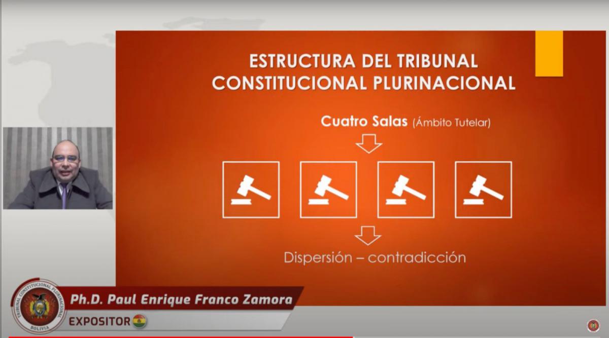 Sobre el contenido del curso, el Presidente del TCP, Ph.D. Paul Enrique Franco Zamora, señaló que se desarrollaron aspectos conceptuales doctrinarios y de información para acceder a la base jurisprudencial de orden tutelar, normativa y competencial de la institución, a través de su plataforma digital (tcpbolivia.bo/tcp/).