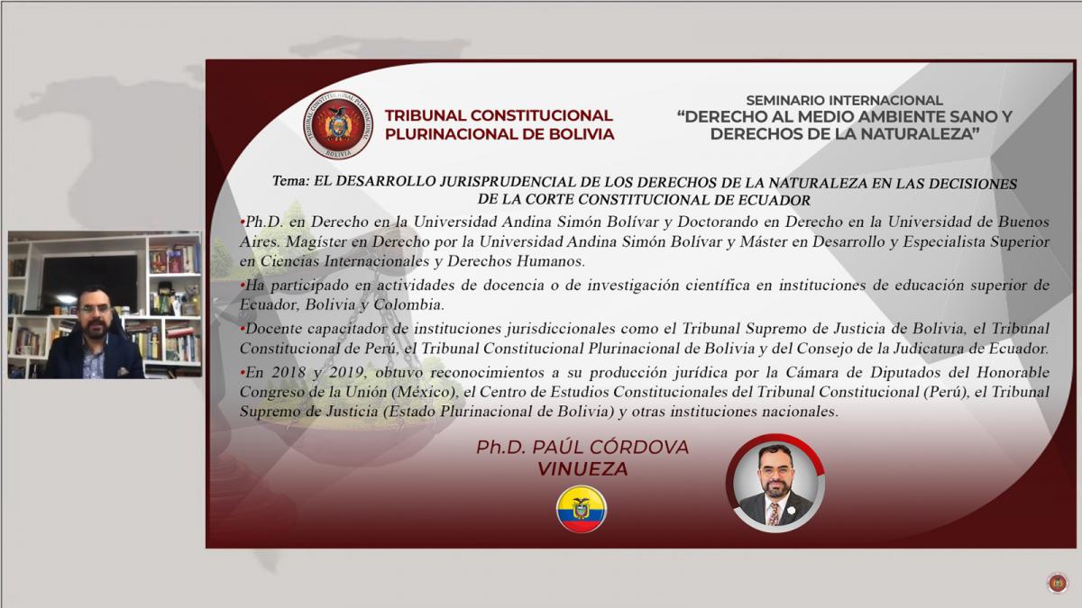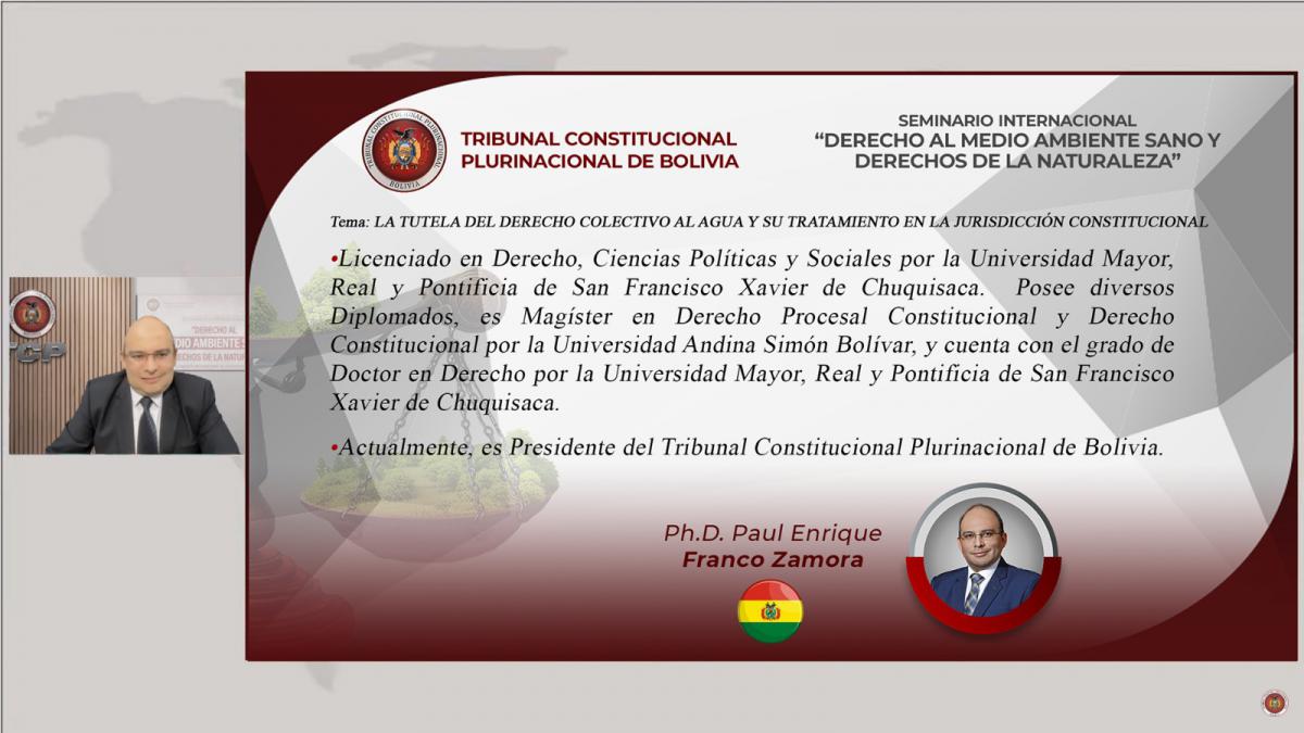 En el Seminario Internacional organizado por el Tribunal Constitucional Plurinacional (TCP), 14 destacadas expositoras y expositores internacionales y del país, promovieron la reflexión sobre los derechos del medio ambiente y de la naturaleza, para generar conciencia medioambiental a raíz de la contaminación del planeta que afecta al ejercicio de los derechos humanos.