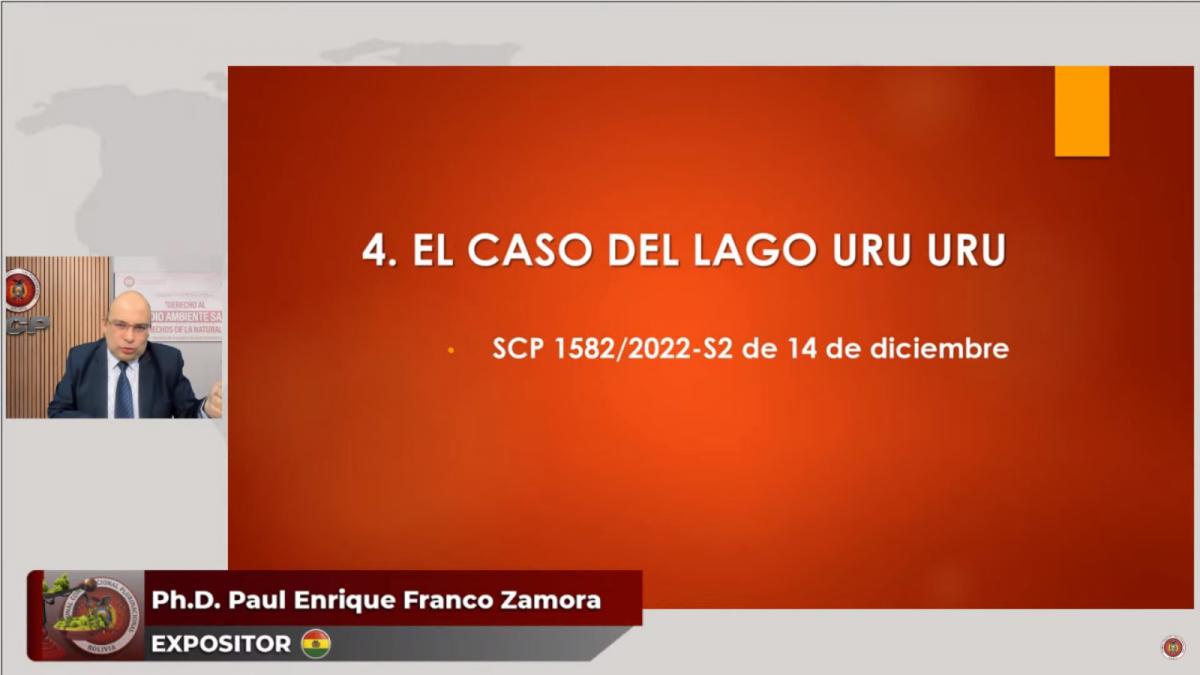 En la segunda jornada del evento, el Presidente del TCP, Ph.D. Paul Enrique Franco Zamora, presentó la ponencia referida a “La Tutela del Derecho Colectivo al Agua y su Tratamiento en la Jurisdicción Constitucional”, y efectuó una explicación sobre el resguardo jurídico y el tratamiento otorgado por esta jurisdicción al líquido vital, a través de casos emblemáticos, como refiere la Sentencia Constitucional Plurinacional 1582/2022-S2 de 14 de diciembre, sobre la contaminación del Lago Uru Uru del departamento de Oruro.