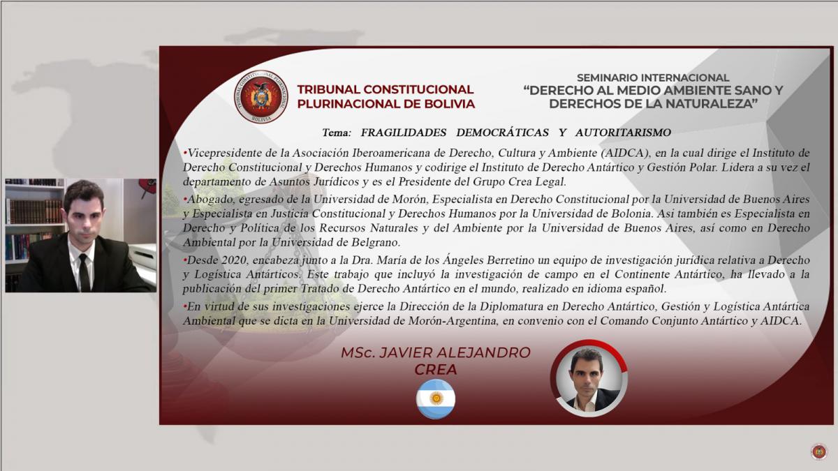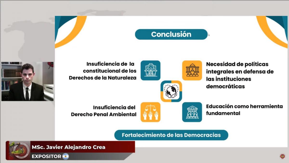 Por su parte, la Presidenta del Tribunal Agroambiental, MSc. María Tereza Garrón Yucra (Bolivia), explicó los “Desarrollos Jurisprudenciales de Protección al Medio Ambiente y la Madre Tierra”; y el Vicepresidente de la Asociación Iberoamericana de Derecho Cultura y Ambiente (AIDCA), MSc. Javier Alejandro Crea (Argentina), se refirió a las “Fragilidades Democráticas y Autoritarismo Ambiental”.