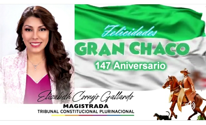 Provincia Gran Chaco, un pilar fundamental que aporta con el desarrollo y crecimiento a nuestra querida Bolivia. Nuestra Región Autónoma, es la única y primera en el país, sea siempre la vanguardia de erradicar la extrema pobreza, resguardar el ejercicio de los derechos fundamentales según la Constitución Política del Estado, somos gente de trabajo, nuestras familias y antepasados nos dejaron el legado de lucha desde este bastión de la soberanía nacional que develó a la gran nación boliviana. Por eso en esta ocasión, la Dra. Julia Elizabeth Cornejo Gallardo, Magistrada del Tribunal Constitucional Plurinacional de Bolivia-TCP, brinda sus felicitaciones a esa linda tierra Chaqueña; ¡QUE VIVA EL 12 DE AGOSTO Y VIVA EL GRAN CHACO!