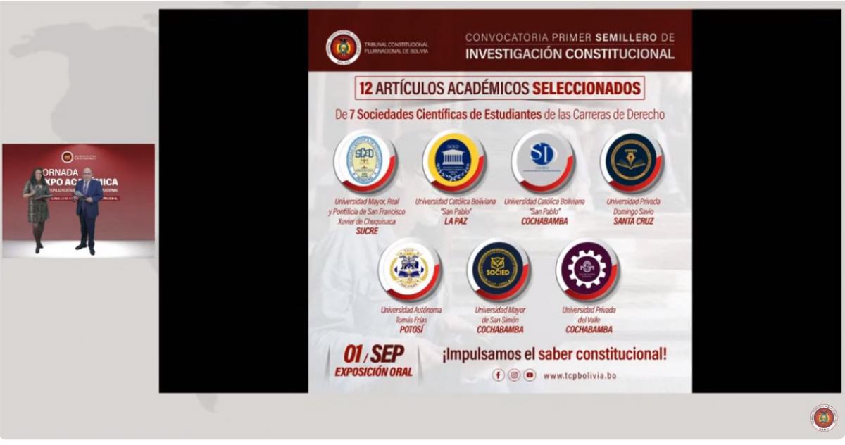 El Tribunal Constitucional Plurinacional de Bolivia (TCP), conformó su “Primer Semillero de Investigación Constitucional”, con estudiantes de las Sociedades Científicas de Derecho de las Universidades del país, después de haber culminado con éxito la Jornada Expo Académica, donde se presentaron 12 artículos redactados en temáticas de Derecho Constitucional y Derecho Procesal Constitucional, Protección Jurídica del Medio Ambiente, Derechos Humanos y Grupos Vulnerables, así como Nuevas Tecnologías Aplicadas a la Justicia, ante un jurado calificador conformado por destacadas y destacados profesionales del ámbito nacional e internacional.