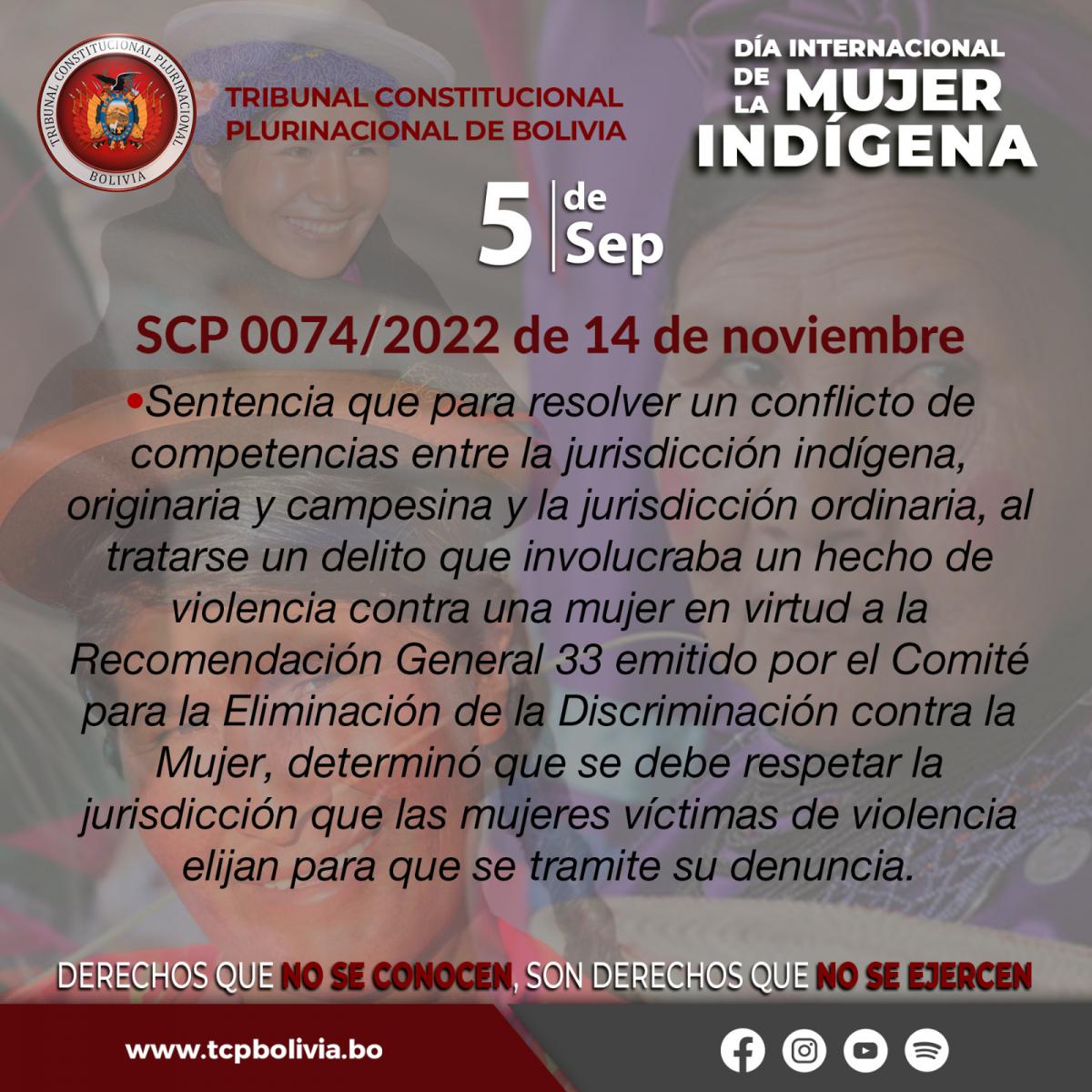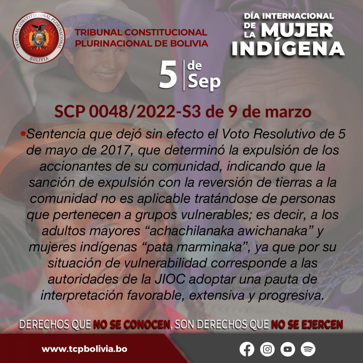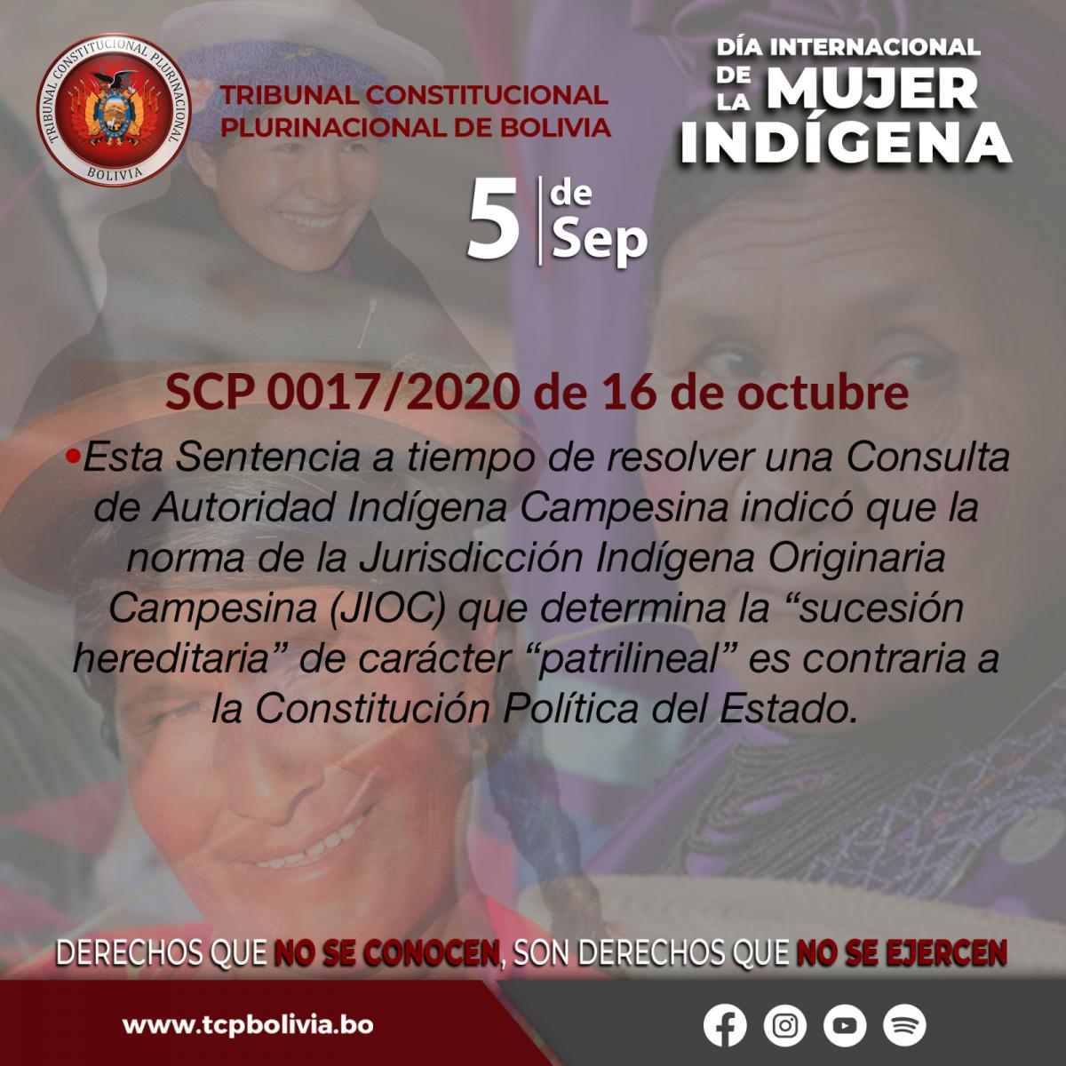 En el Día Internacional de la Mujer Indígena el Tribunal Constitucional Plurinacional de Bolivia (TCP) da a conocer las Sentencias Constitucionales Plurinacionales emitidas en protección de los derechos de las mujeres de la Jurisdicción Indígena Originaria Campesina.