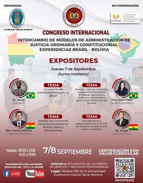 El Magistrado del Tribunal Constitucional Plurinacional de Bolivia (TCP), MSc. Carlos Alberto Caderón Medrano, invita a participar de la actividad académica organizada en coordinación con la Facultad de Ciencias Jurídicas de la Universidad Autónoma Gabriel René Moreno (UAGRM) de la ciudad de Santa Cruz de la Sierra y el apoyo del Grupo de Investigación “Jurisdicción Sin Fronteras” de la Escuela Nacional de Formación de Magistrados (ENFAM).