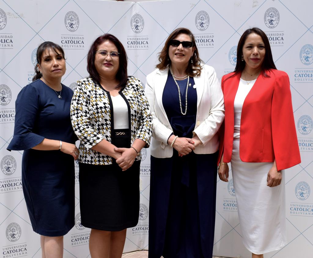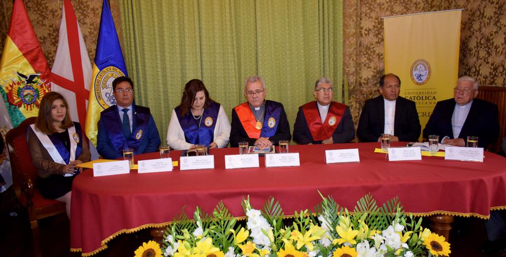 En este importante evento también estuvieron presentes las autoridades de la Iglesia Católica: Mons. Oscar Aparicio Céspedes, Gran Canciller de la Universidad Católica Boliviana “San Pablo”; Mons. Ricardo Ernesto Centellas Guzmán, Arzobispo de la Arquidiócesis de Sucre; y Rvdo. José Fuentes Cano, Rector Nacional de la Universidad Católica Boliviana “San Pablo”; Mons. Edmundo Abastaflor Montero, Arzobispo Emérito de La Paz; Mons. Jesús Juárez Párraga, Arzobispo Emérito de Sucre; así como las autoridades administrativas de la Universidad Católica Boliviana “San Pablo”, Mónica Daza Ondarza Salamanca Vicerrectora Académica; Marcos Delgadillo Moreira, Vicerrector Administrativo Financiero Nacional e Ivana Lira Villarroel, Secretaria General Nacional, entre otros invitados.
