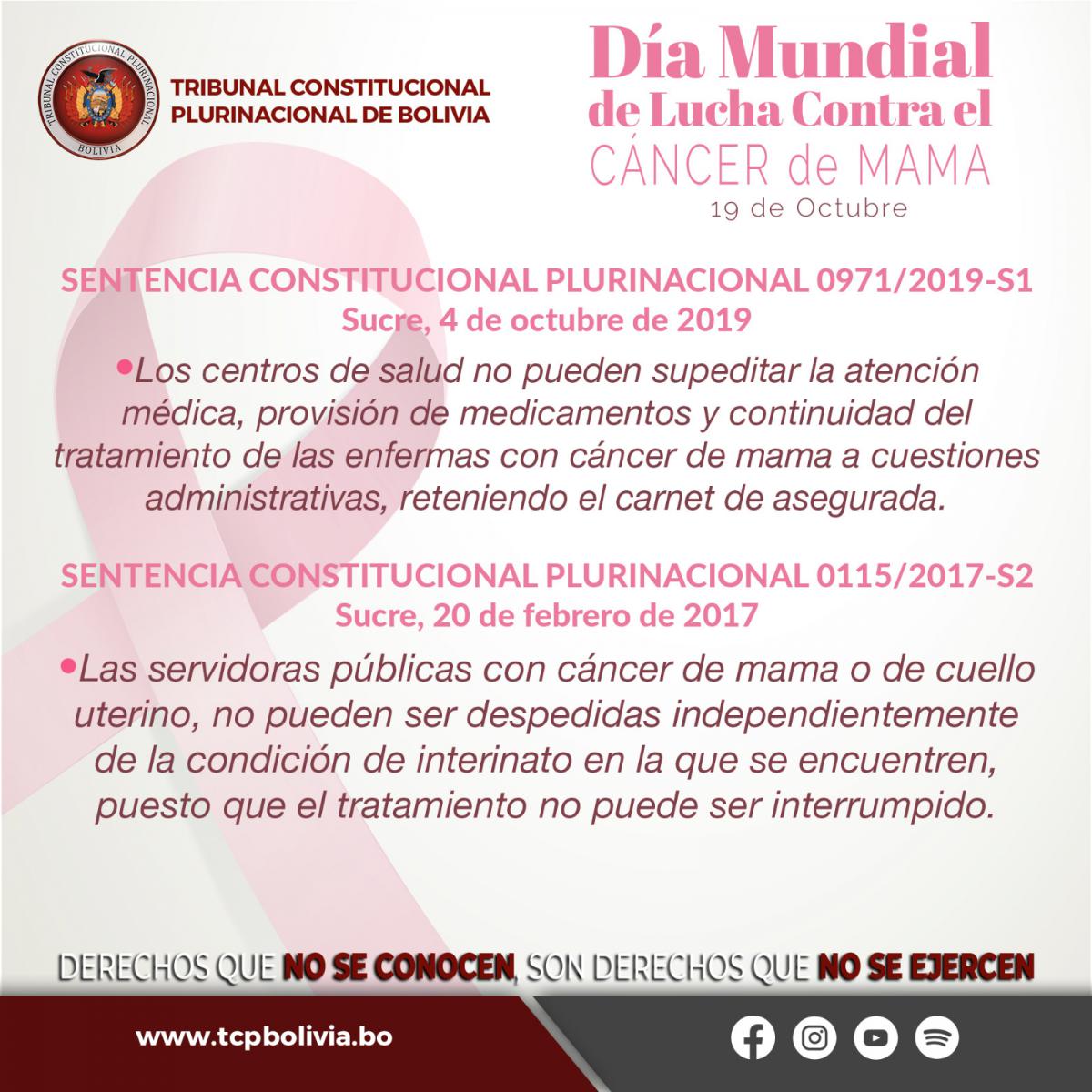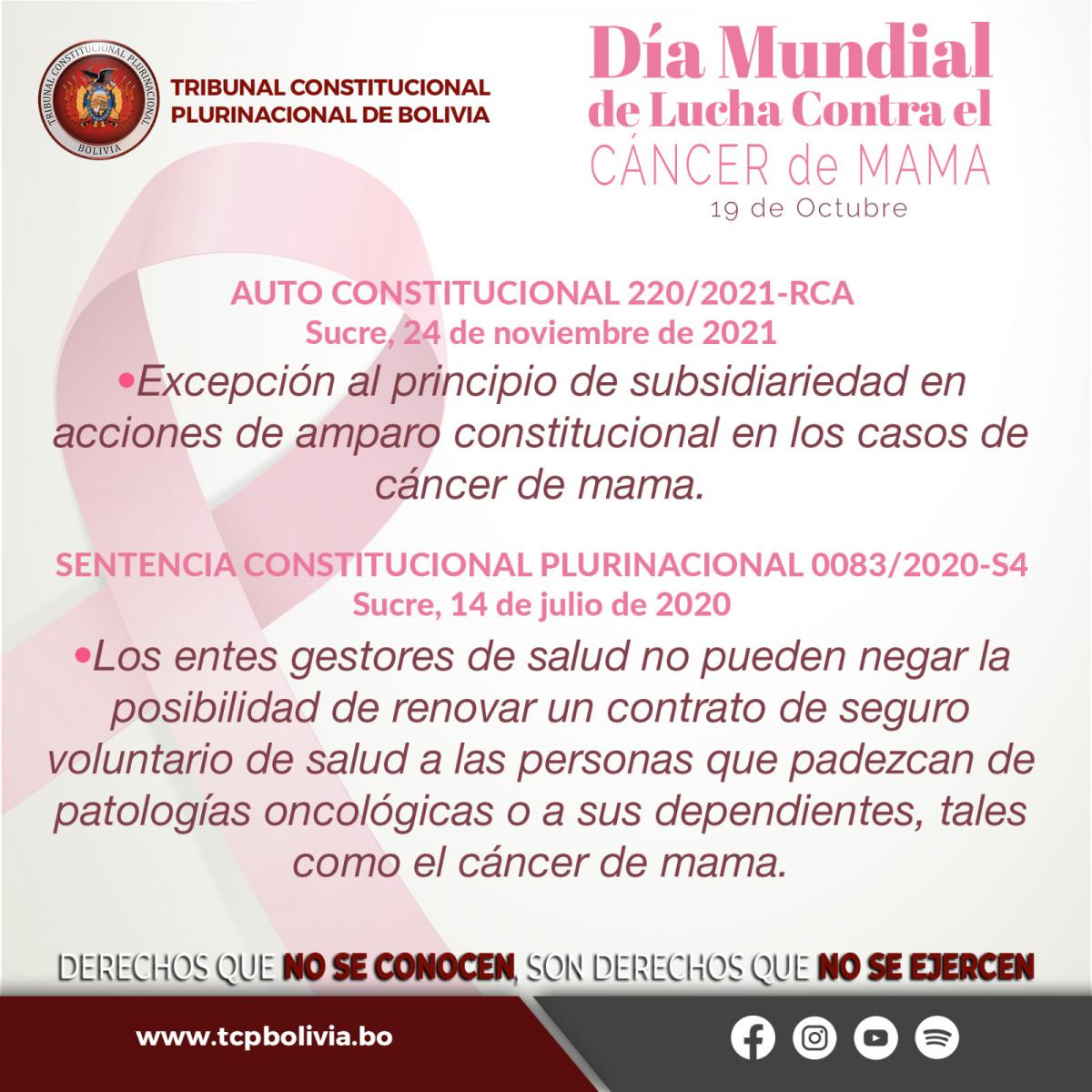 En el Día Mundial de Lucha Contra el Cáncer de Mama, el Tribunal Constitucional Plurinacional de Bolivia –(TCP) da a conocer las Resoluciones Constitucionales Plurinacionales emitidas en resguardo del derecho a la salud de las mujeres en el país.