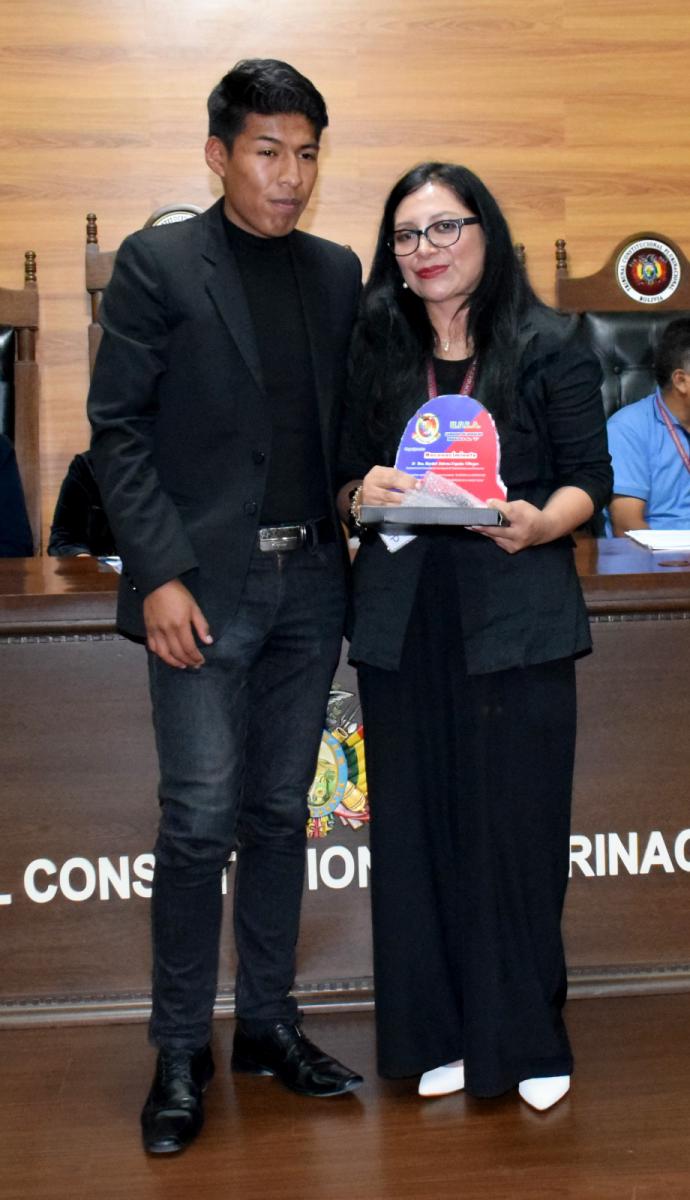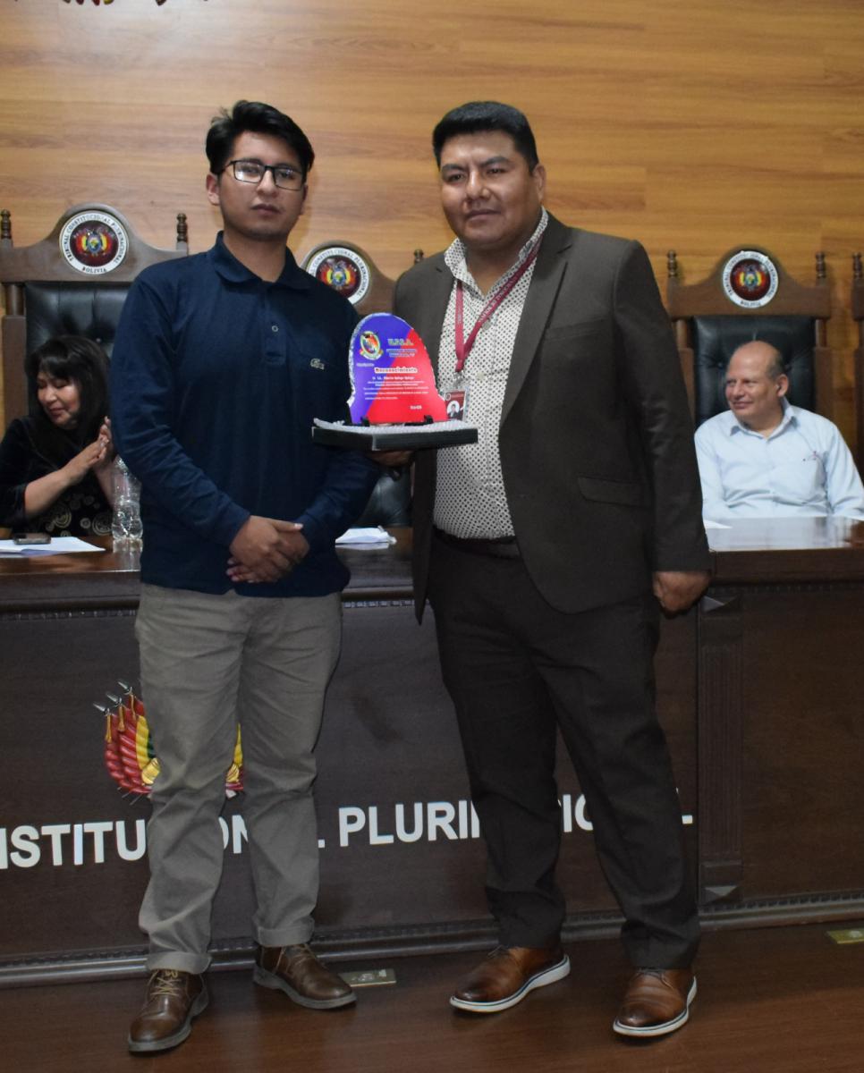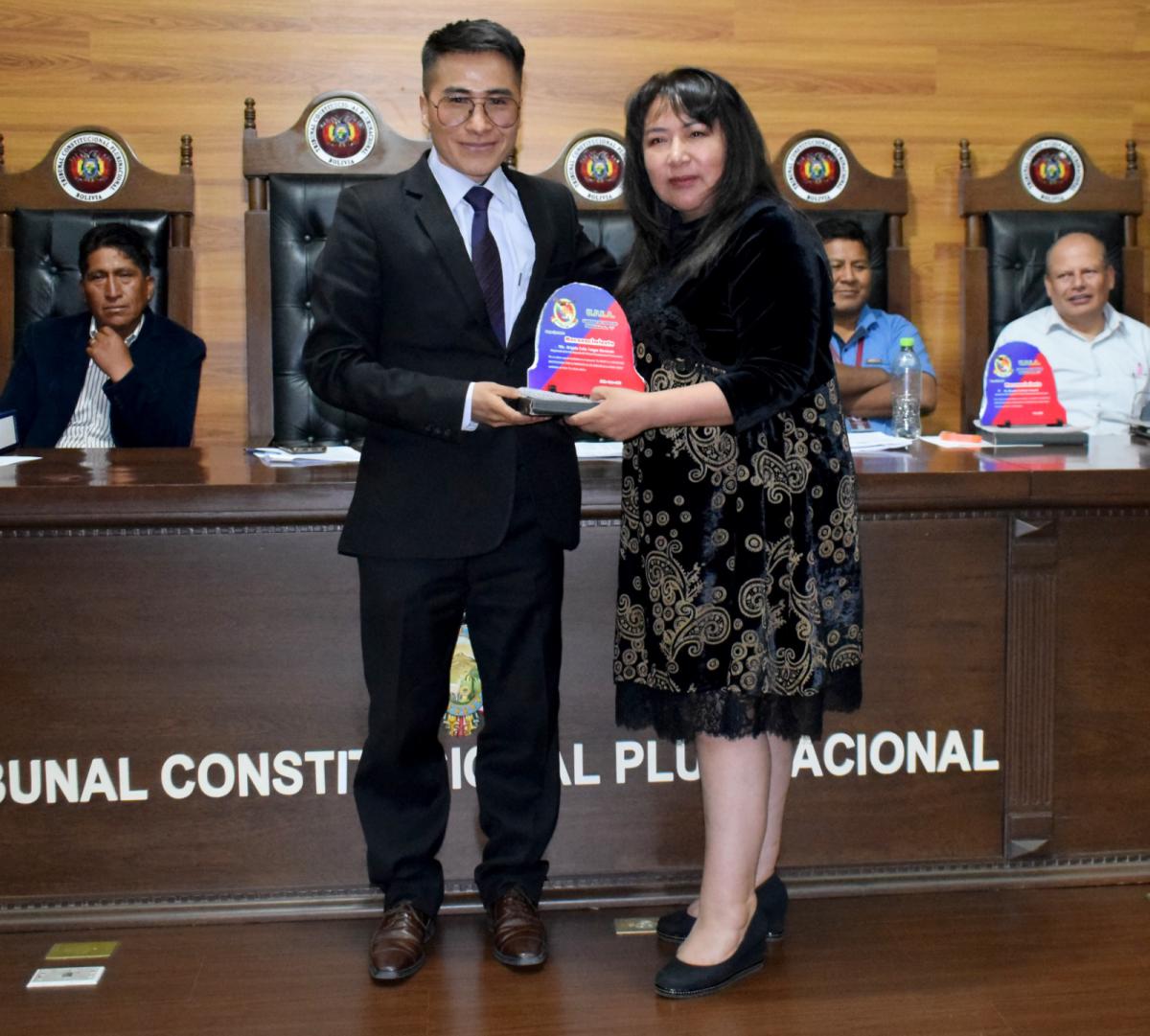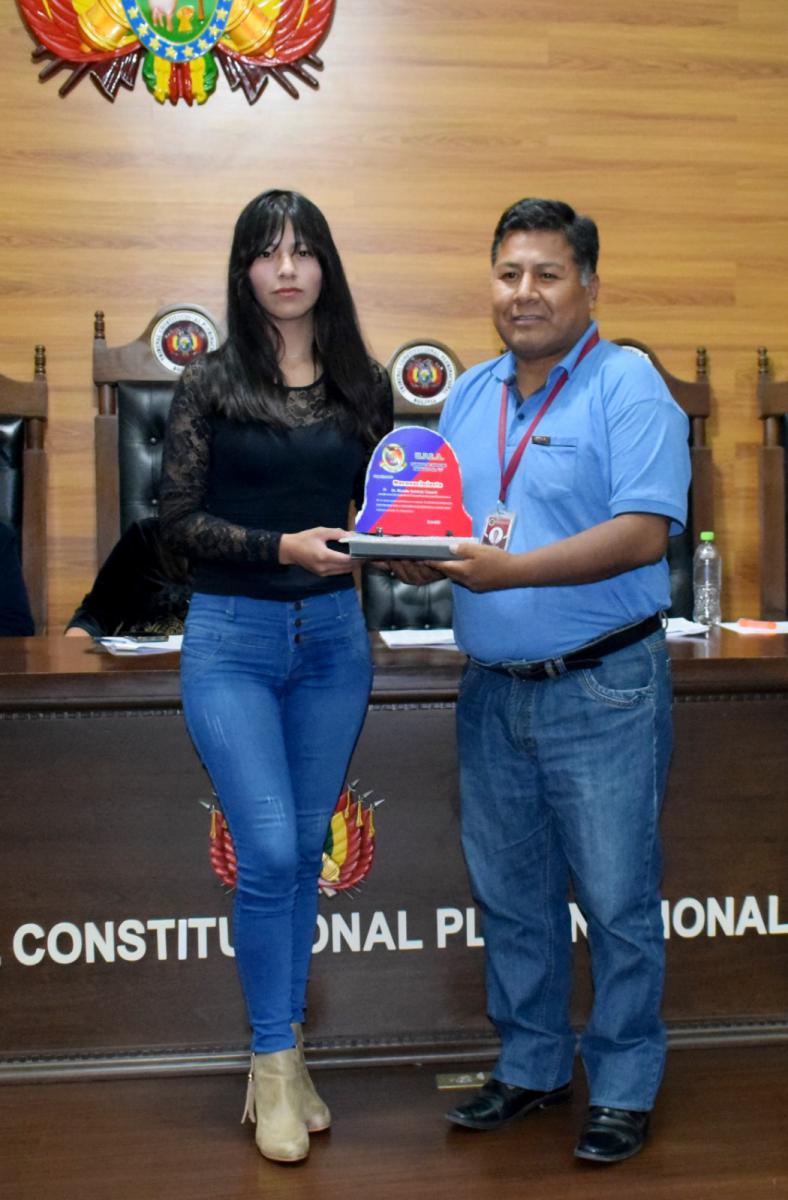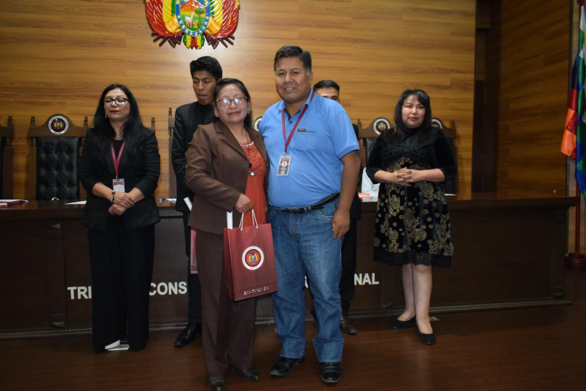 A la conclusión de la actividad, la Magistrada Brigida Vargas, realizó la entrega de presentes a los Docentes y estudiantes que llegaron hasta las instalaciones de institución, quienes en retribución otorgaron plaquetas de reconocimiento a la Autoridad y a los expositores de Sala Segunda, reiterando su gratitud por la predisposición presentada para la realización de los cursos de capacitación desarrollados tanto en la UPEA, la Universidad Mayor de San Andrés y en la Institución.
