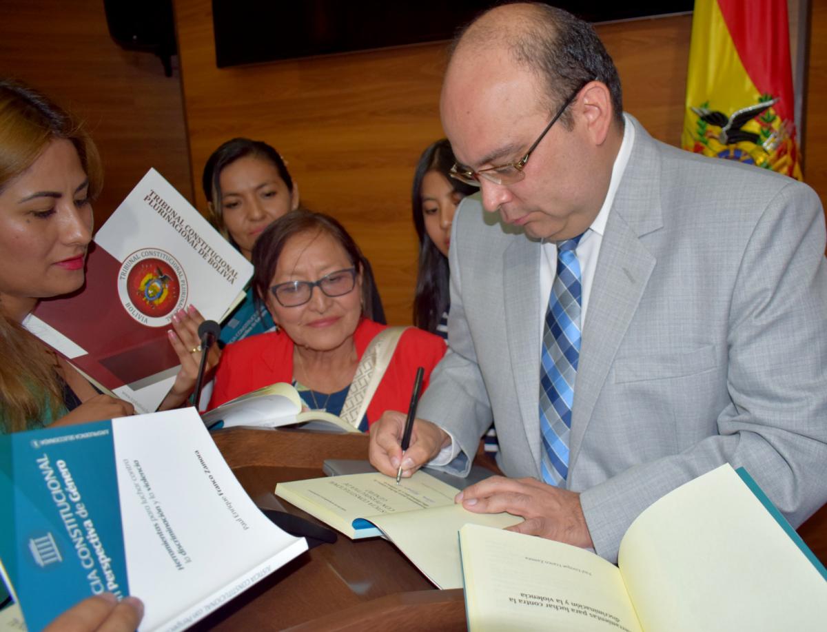 El Presidente del TCP, a tiempo de invitar a las y los estudiantes a participar en el V Congreso Internacional de Derecho Procesal Constitucional. “Corrientes Transformadoras en la Justicia Constitucional”, a llevarse a cabo los días 16,17 y 18 de noviembre en la ciudad de Santa Cruz de la Sierra, obsequió su libro “Justicia Constitucional con Perspectiva de Género”, e informó que, gracias al salto cualitativo que realizó la institución a la brecha digital, y en uso de las tecnologías de la información y la comunicación, la mayoría de las publicaciones se encuentran en el repositorio virtual, todas ellas descargables de forma gratuita.