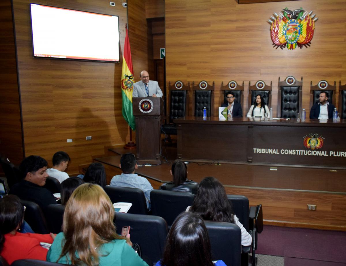 La autoridad, durante su alocución y al momento de dar la bienvenida a las y los universitarios, a nombre de la Sala Plena del TCP y de valorar positivamente la iniciativa de las autoridades de ambas universidades, manifestó que la Entidad tiene las puertas abiertas para la juventud boliviana interesada en conocer la labor que desarrolla la institución, para velar por la supremacía de la Constitución Política del Estado, ejercitar el control de constitucionalidad y precautelar el respeto y la vigencia de los derechos y garantías constitucionales de la población.