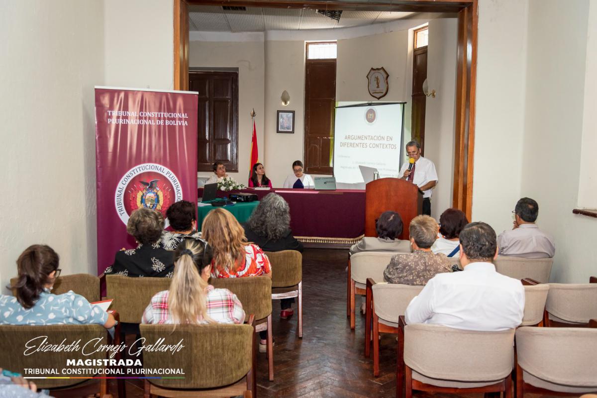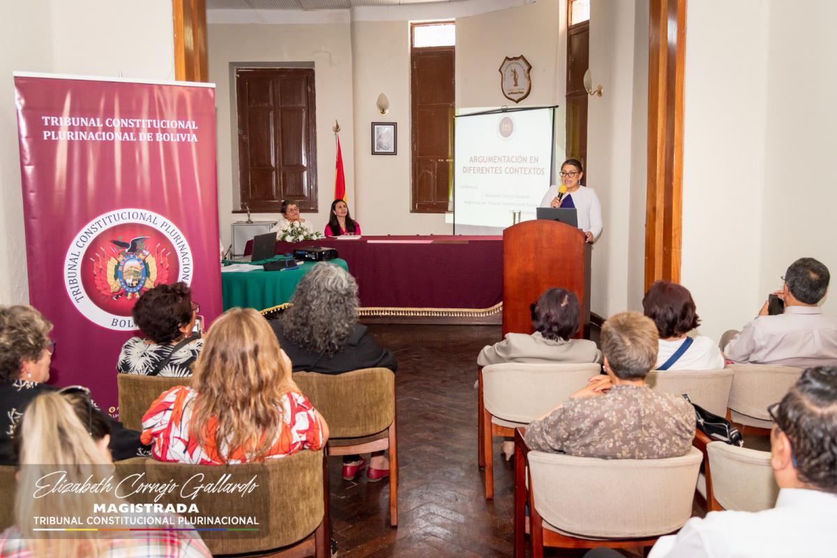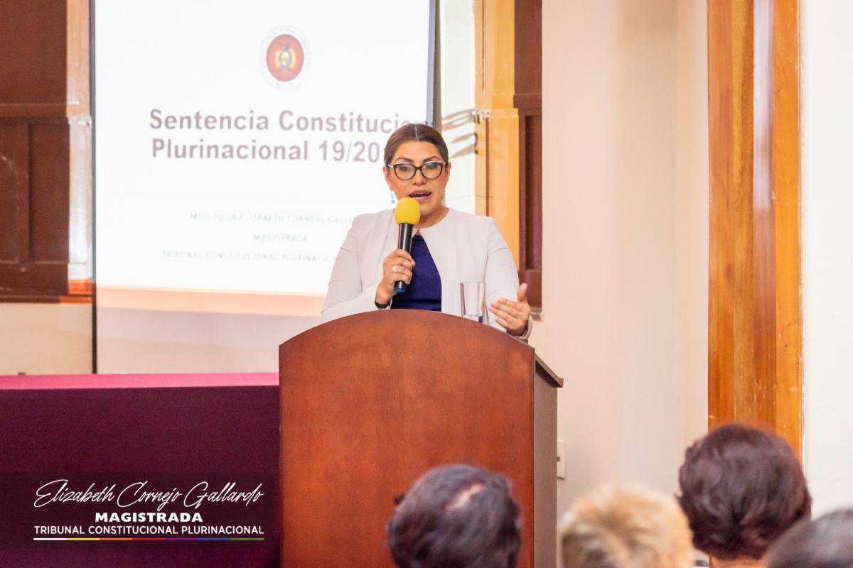 En ese marco, la MSc. Julia Elizabeth Cornejo Gallardo, Magistrada del Tribunal Constitucional Plurinacional, electa por el departamento de Tarija, a invitación de los organizadores presentó la ponencia “Justicia constitucional y argumentación con perspectiva de género”. Temática que motivó interés y agradecimiento de los participantes, en particular por la socialización que realizó la autoridad de las Sentencias Constitucionales Plurinacionales relevantes que aplicaron perspectiva de género en la justicia constitucional.