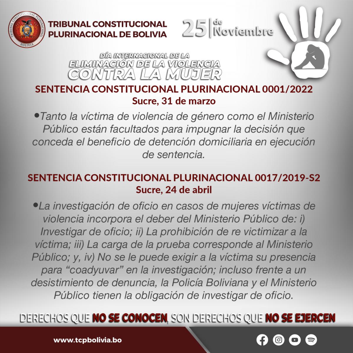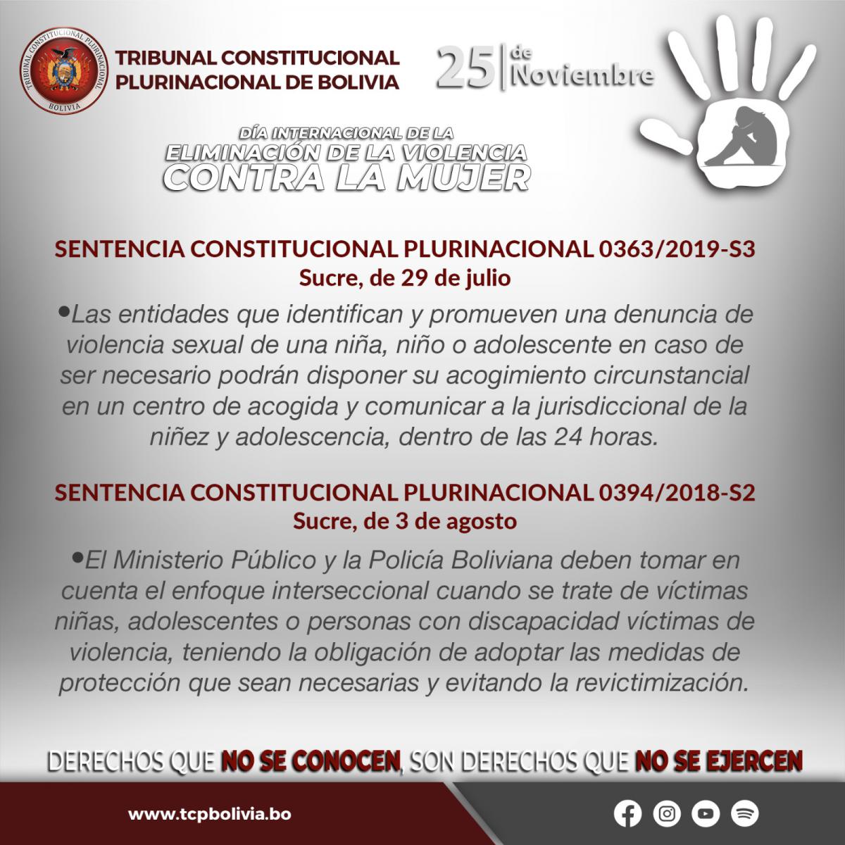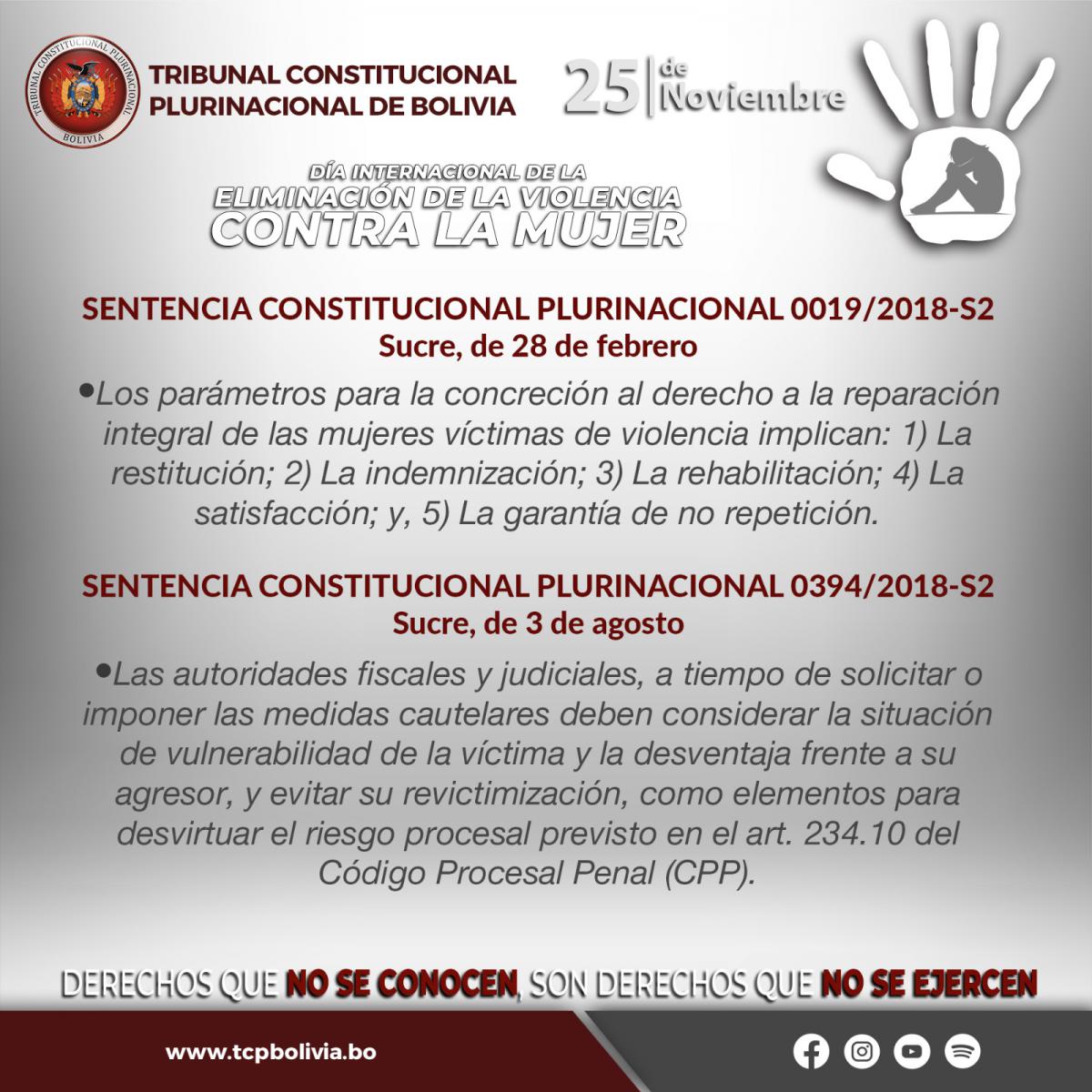 El Tribunal Constitucional Plurinacional de Bolivia (TCP), en el “Día Internacional de la Eliminación de la Violencia Contra la Mujer”, da a conocer las Sentencias Constitucionales Plurinacionales emitidas en resguardo de los derechos de las mujeres.