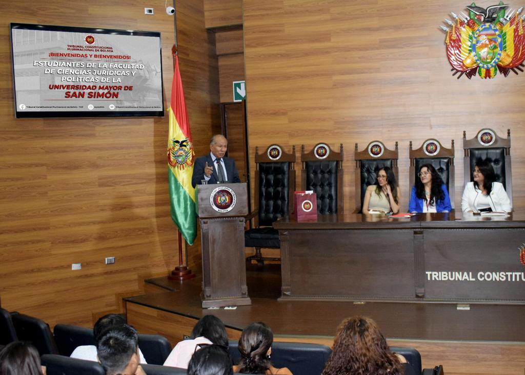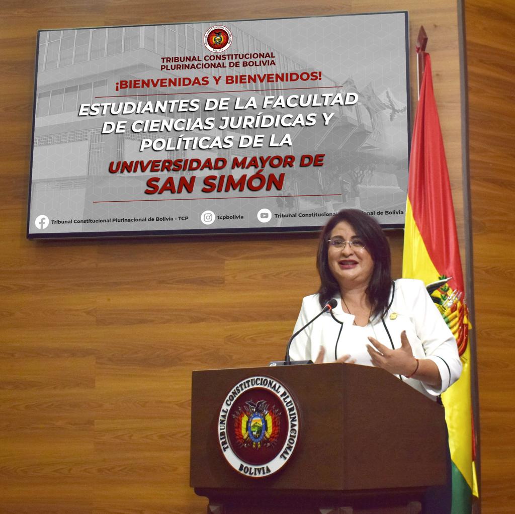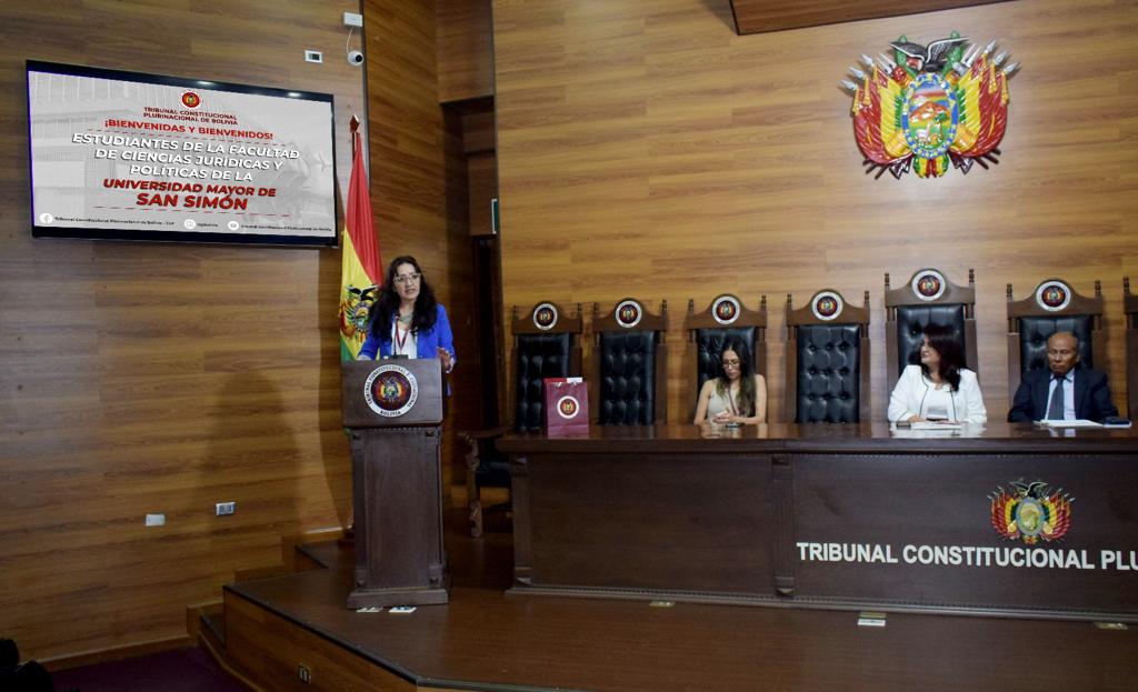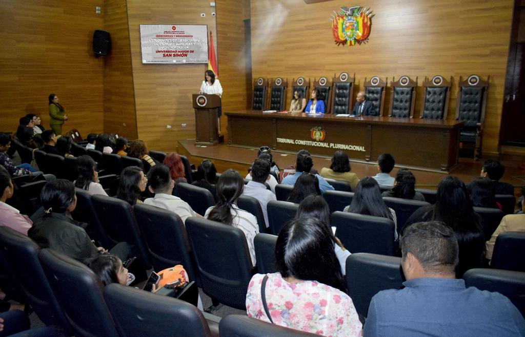 En el marco del programa de interacción de la Universidad Mayor de San Simón de la ciudad de Cochabamba, estudiantes de cuarto año de la Facultad de Ciencias Jurídicas y Políticas visitó esta jornada el Tribunal Constitucional Plurinacional de Bolivia (TCP), donde fueron recibidos por la Magistrada MSc. Karem Lorena Gallardo Sejas y participaron de un curso de capacitación para conocer la naturaleza y funciones de la Entidad.