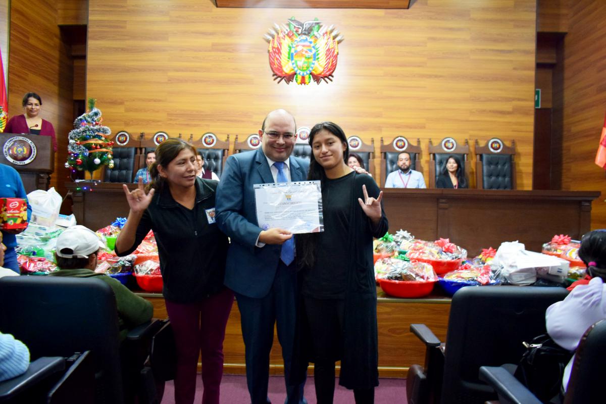 En la oportunidad, la Unidad Educativa de Audiología efectuó la entrega de un certificado de reconocimiento al Tribunal Constitucional Plurinacional en manos de su Presidente, manifestando su agradecimiento en lenguaje de señas, por el compromiso solidario y valoración a la persona sorda.