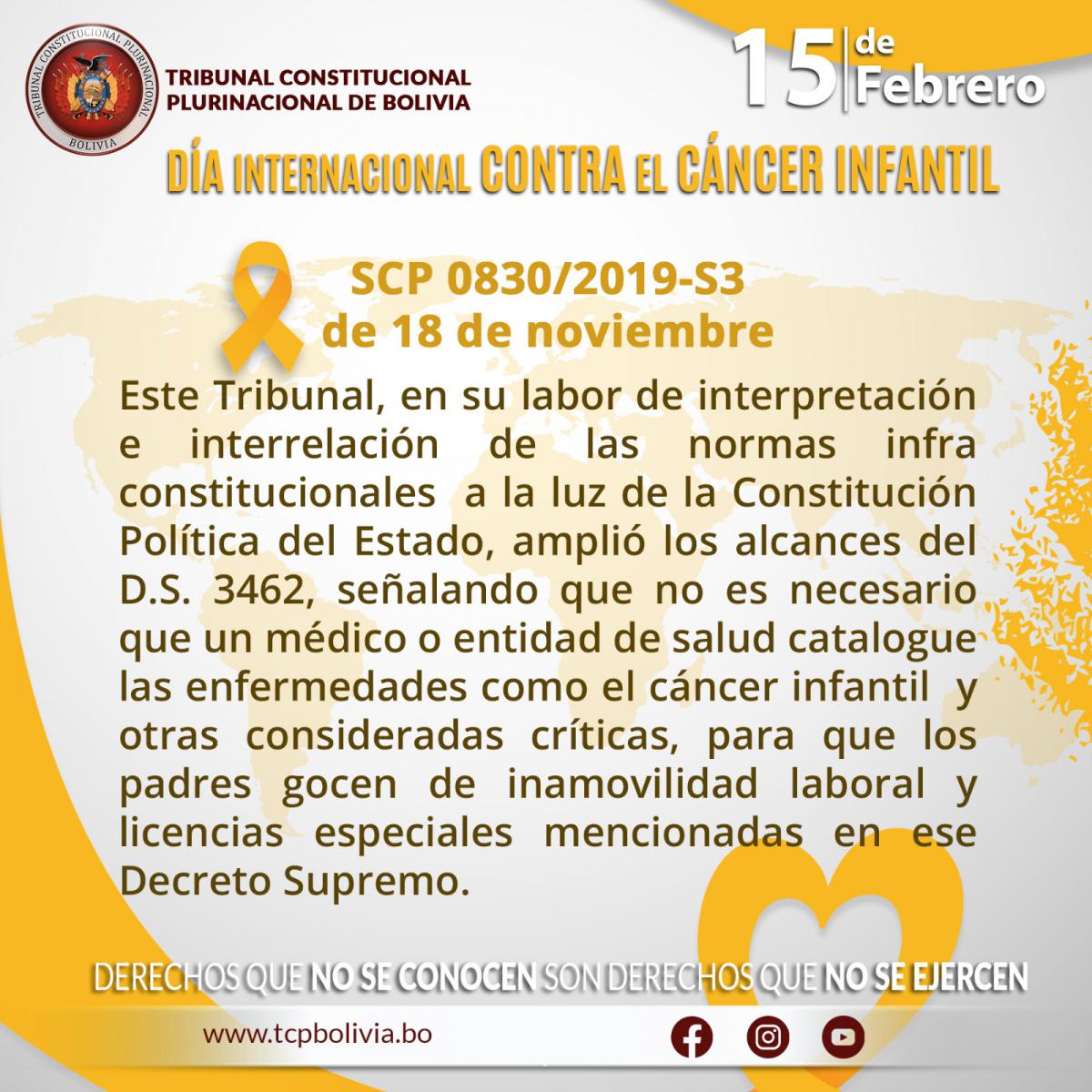 DÍA INTERNACIONAL CONTRA EL CÁNCER INFANTIL, SENTENCIA CONSTITUCIONAL PLURINACIONAL 0830/2019-S3 Publicación de la entrada:15 de febrero de 2024 Categoría de la entrada:Noticias En el Día Internacional Contra el Cáncer Infantil damos a conocer la Sentencia Constitucional Plurinacional 0830/2019-S3 que protege los derechos de las niñas y niños afectados por esta enfermedad.Accede al contenido de la sentencia http://tinyurl.com/2cabej6h«Derechos que no se conocen, son derechos que no se ejercen» Etiquetas: Noticias Leer más artículos Entrada anteriorCOMUNIDAD COCHABAMBINA APROBÓ ESTATUTO AUTONÓMICO A FINALES DE 2023 Siguiente entradaESTUDIANTES DE LA CARRERA DE DERECHO DE LA UNIVERSIDAD PRIVADA DOMINGO SAVIO VISITAN EL TCP También podría gustarte SALUTACIÓN DE LA MAGISTRADA MSc. ISIDORA JIMÉNEZ CASTRO 13 de octubre de 2024 PRESIDENTE DEL TCP COMENTÓ EL LIBRO: “REFORMA AGRARIA EN BOLIVIA: LA HISTORIA NO CONTADA”, DE JUAN MANUEL NAVARRO AMELLER Y RAMÓN ROCHA MONROY 11 de septiembre de 2023 TCP de Bolivia realizó Seminario de Derechos y Fundamentos de la Justicia Constitucional 6 de junio de 2019