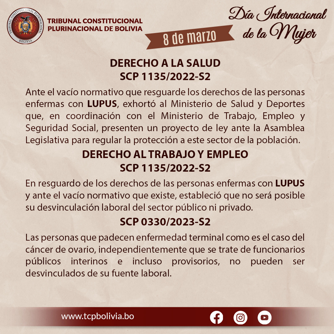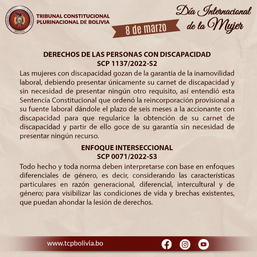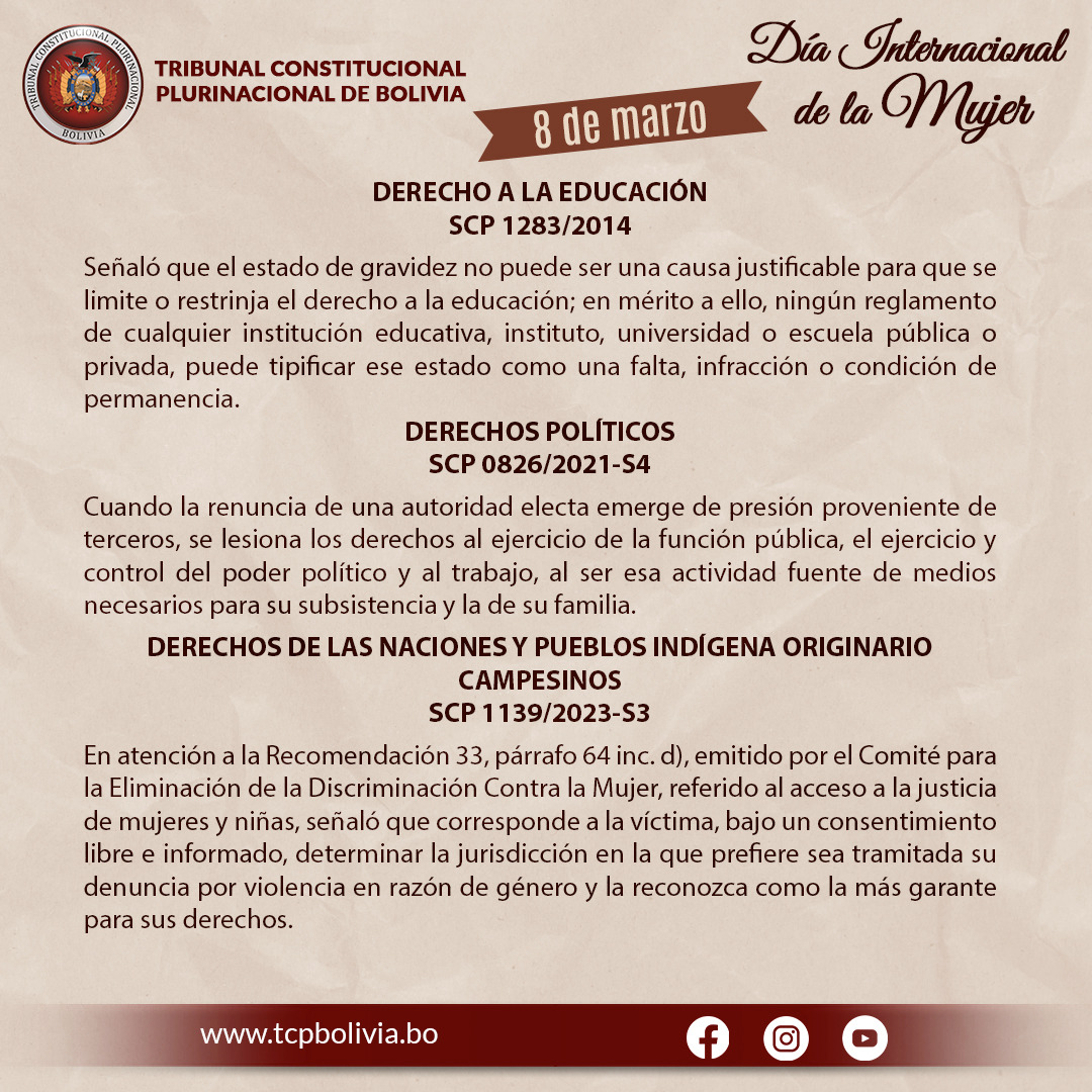 En el Día Internacional de la Mujer compartimos las Sentencias Constitucionales Plurinacionales emitidas por el Tribunal Constitucional Plurinacional de Bolivia (TCP) en resguardo de los derechos de las mujeres.