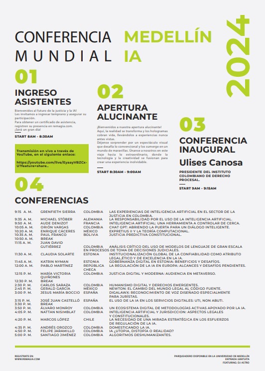 La Conferencia se desarrolló de forma presencial y virtual el pasado 22 de febrero en la ciudad de Medellín, con la participación de 20 destacados expertos, juristas, y académicos de Alemania, Bolivia, Chile, Colombia, Estonia, España, Francia y República Checa, quienes compartieron sus conocimientos y experiencias en conferencias magistrales, donde de forma unánime resaltaron que los desafíos y oportunidades que brinda la IA en el ámbito judicial es bastante amplio.