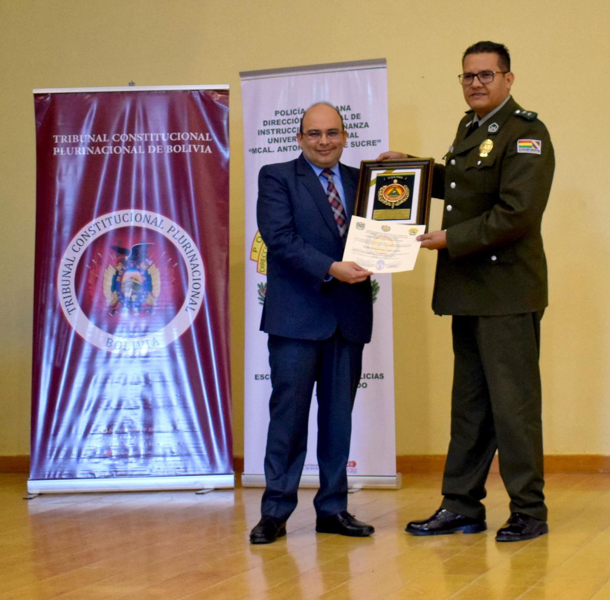 A la conclusión de la intervención del Presidente del TCP, el Tcnl. DEAP. Carlos Morón del Castillo, Coordinador de Postgrado de la Escuela Superior de Policías Chuquisaca, a nombre de la Policía Boliviana y en agradecimiento por los conocimientos impartidos, hizo entrega de un Certificado y Plaqueta de Reconocimiento al Ph.D. Paul Enrique Franco Zamora, destacando su compromiso de trabajo con la impartición de justicia enfocado en el Derecho Constitucional y los Derechos Humanos.
