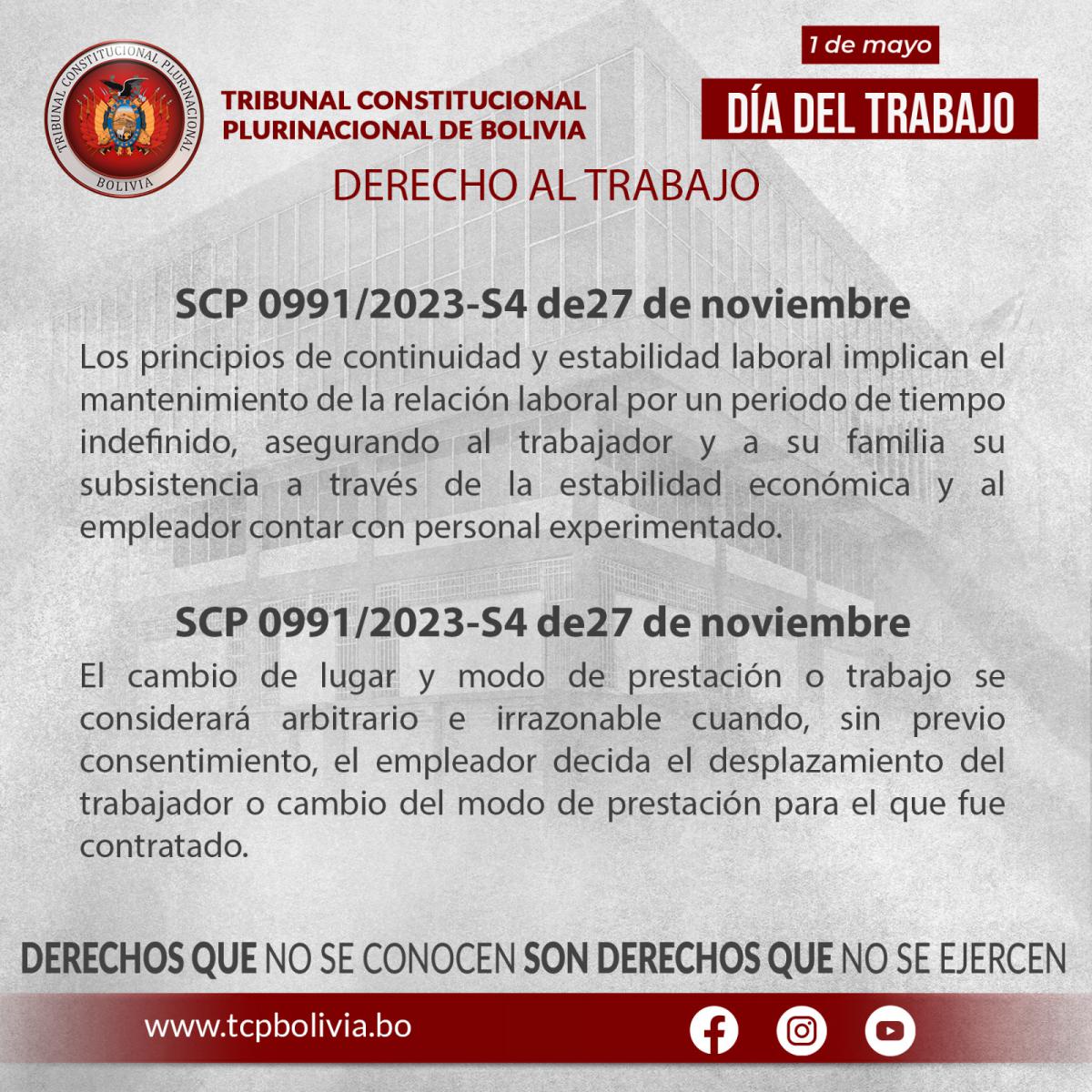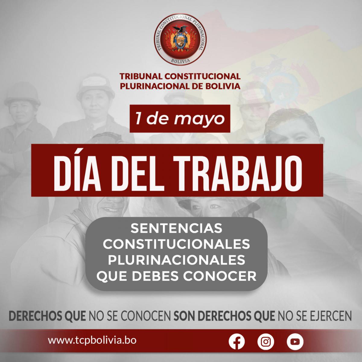 En el Día del Trabajo, desde el Tribunal Constitucional Plurinacional de Bolivia (TCP) expresamos nuestro reconocimiento y salutación especial a la población trabajadora del país, a las mujeres y hombres que cada día con su comprometido esfuerzo aportan al progreso nacional, labor que es digna de destacar!.
