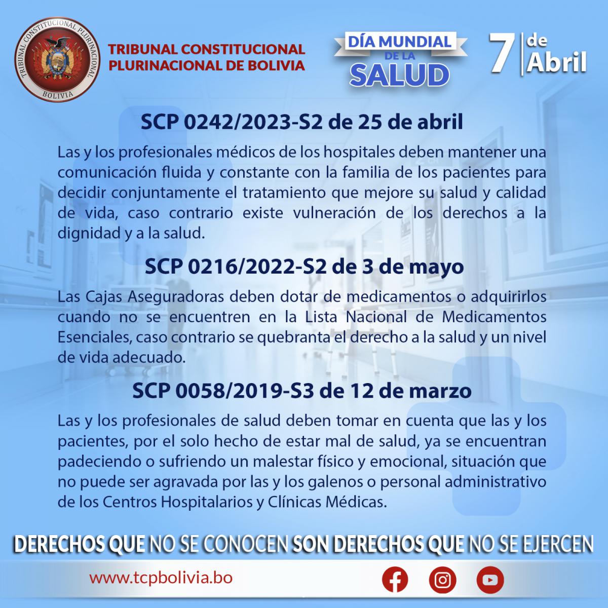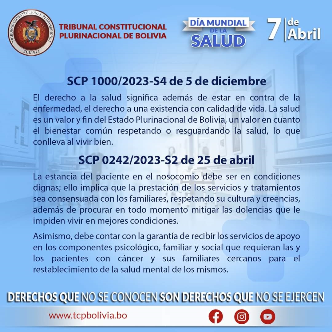 En el Día Mundial de la Salud compartimos las Sentencias Constitucionales Plurinacionales que ha pronunciado el Tribunal Constitucional Plurinacional de Bolivia en resguardo del derecho fundamental de las bolivianas y bolivianos.