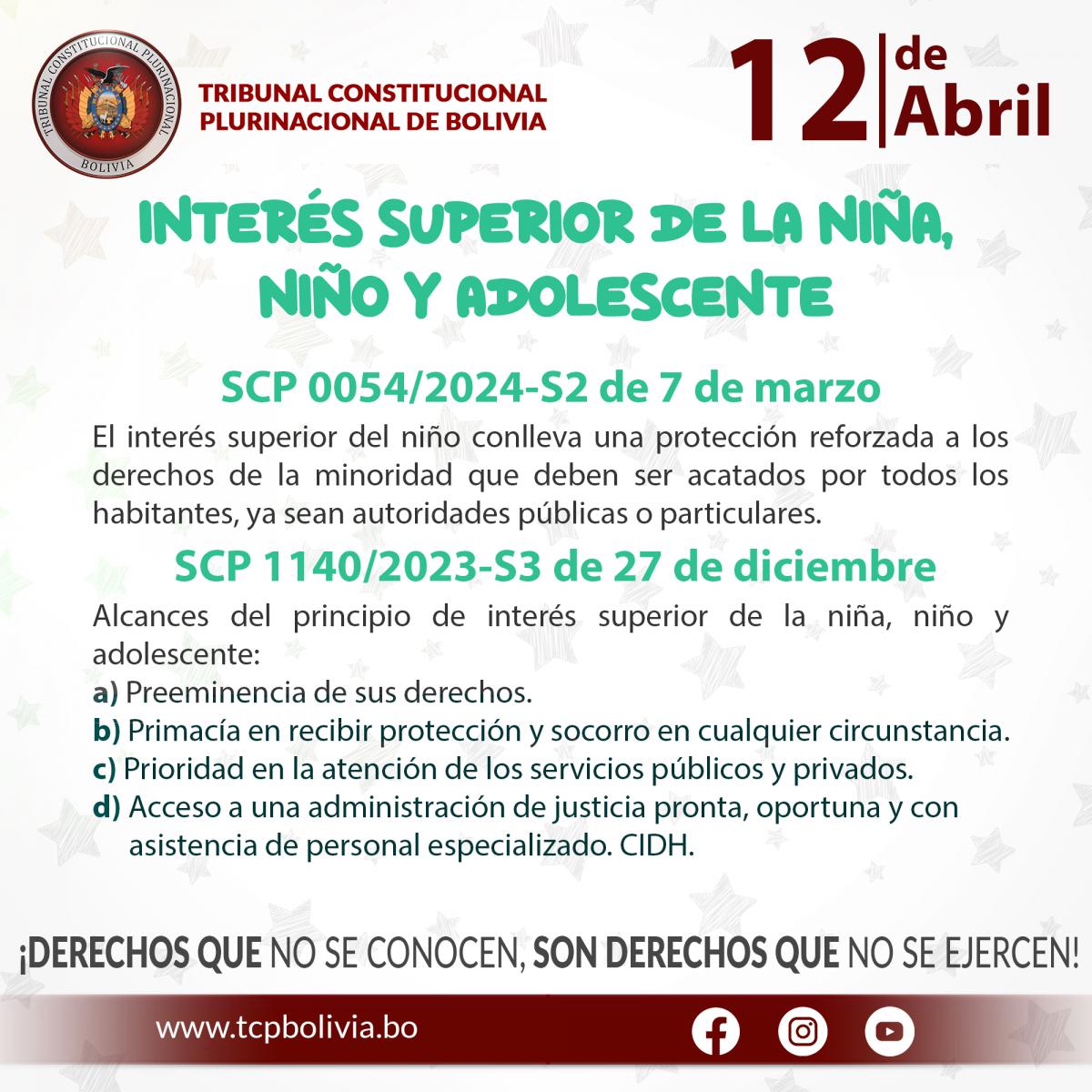 Esta jornada del “Día de la Niña y el Niño Boliviano”, damos a conocer las Sentencias Constitucionales Plurinacionales emitidas por el Tribunal Constitucional Plurinacional de Bolivia (TCP), con relación al Interés Superior de la Niña, Niño y Adolescente para una protección reforzada de sus derechos.
