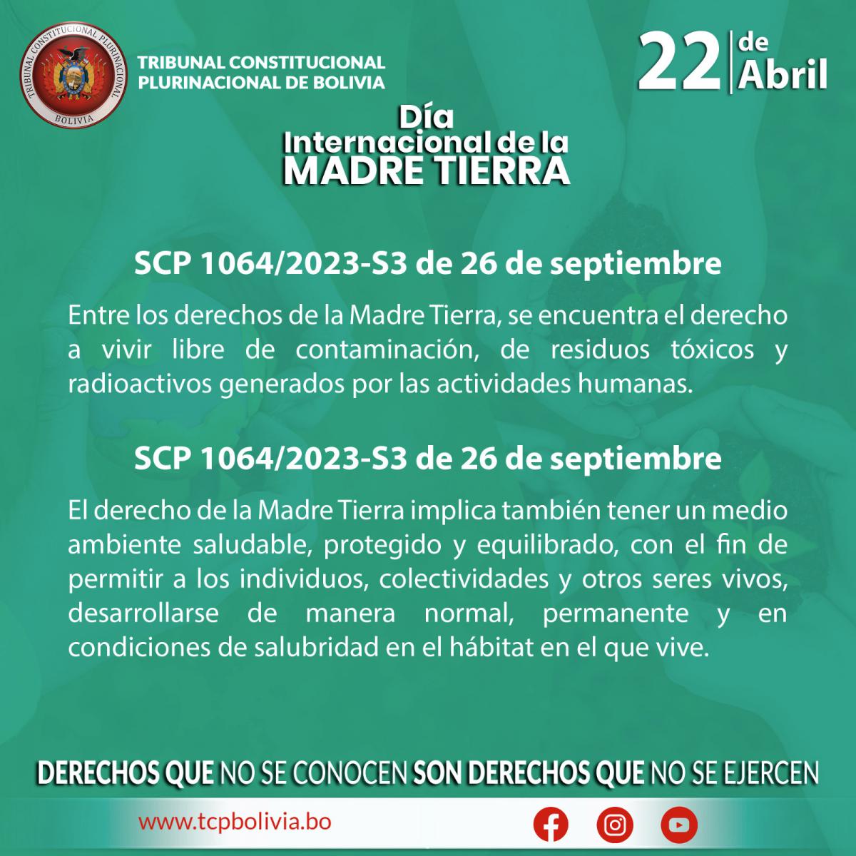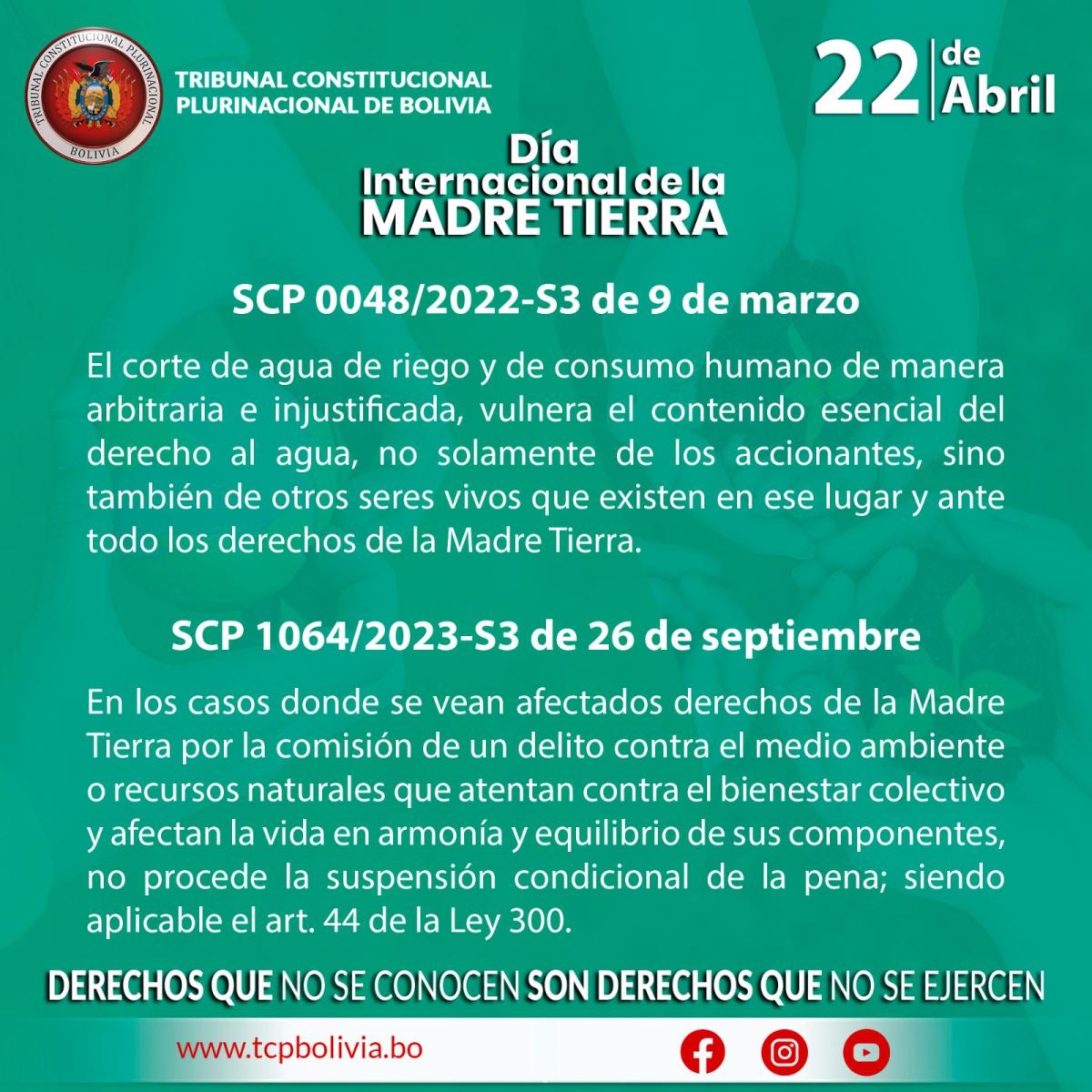 En esta fecha especial, compartimos las Sentencias Constitucionales Plurinacionales emitidas por el Tribunal Constitucional de Bolivia (TCP), en resguardo de los derechos de la Madre Tierra, promoviendo su respeto y cuidado.