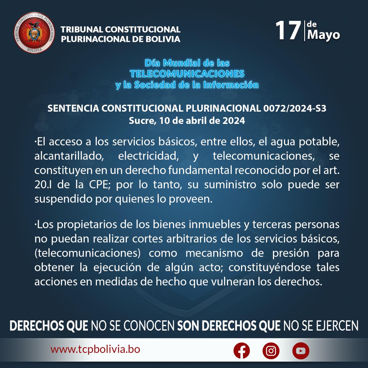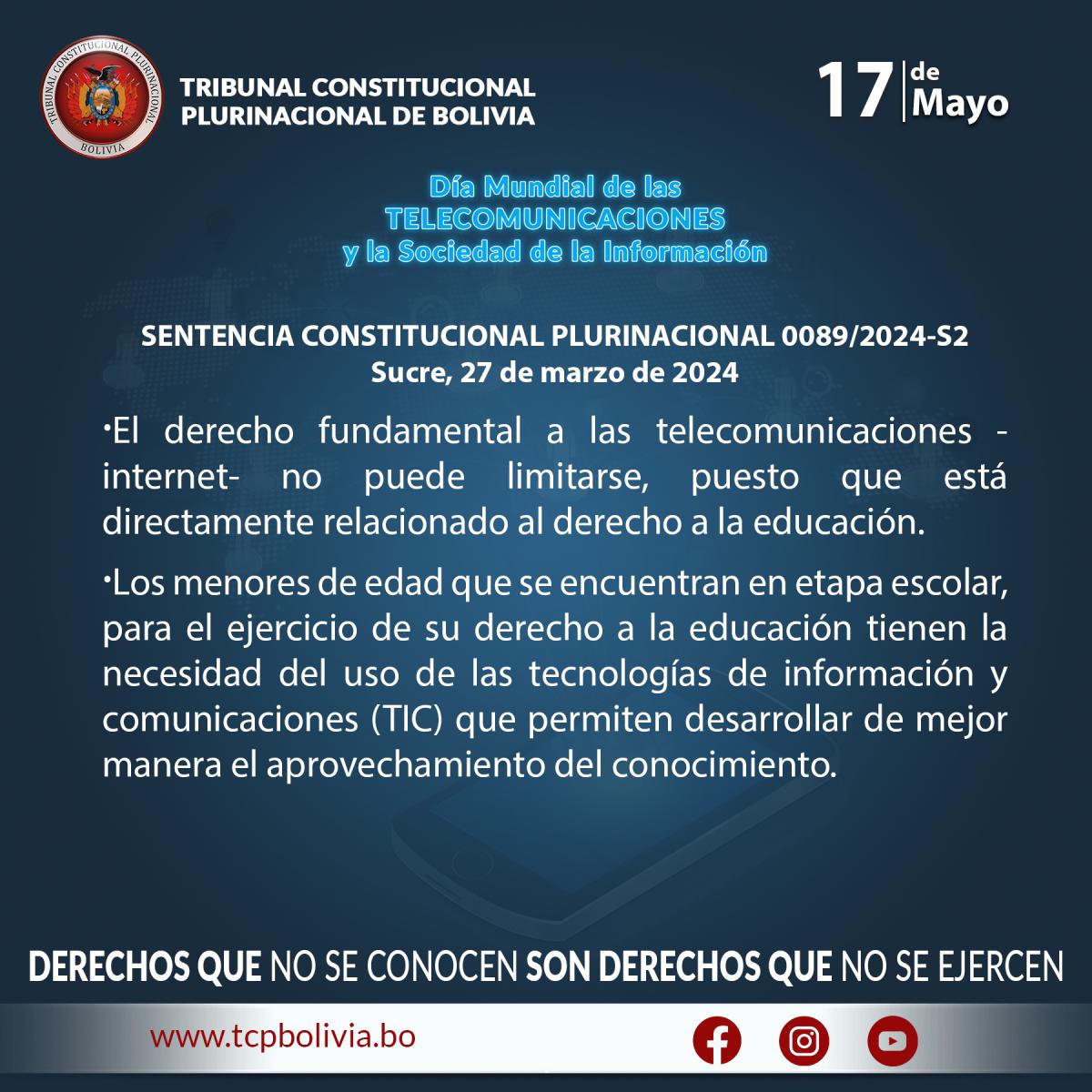 En el Día Mundial de las Telecomunicaciones y la sociedad de la Información damos a conocer las Sentencias Constitucionales Plurinacionales pronunciadas por el Tribunal Constitucional Plurinacional, en resguardo del derecho fundamental de la población de acceso al internet y otras tecnologías de la información y las comunicaciones (TIC).