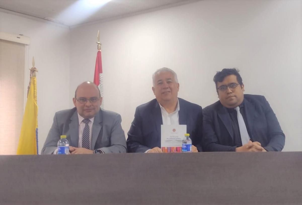 Durante su intervención el Presidente Franco Zamora, explicó a la comunidad universitaria colombiana acerca de los principios que rigen al Estado plurinacional y cómo viene desarrollándose el derecho plurinacional, información que contiene el libro de su autoría intitulado: “Derecho Plurinacional. Pluralismo Jurídico y Jurisdicción Indígena Originaria Campesina”, publicación que, en la ocasión, hizo entrega al Profesor Alfonso Jaime Martinez Lazcano, Presidente del Colegio de Abogados Procesalistas de Latinoamérica.