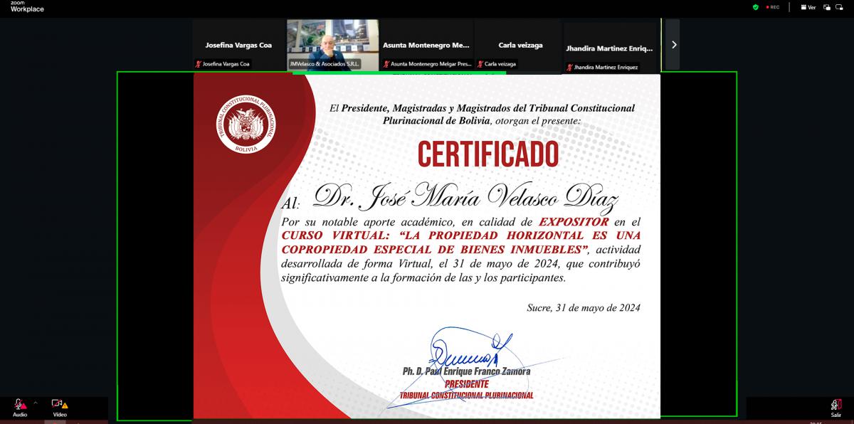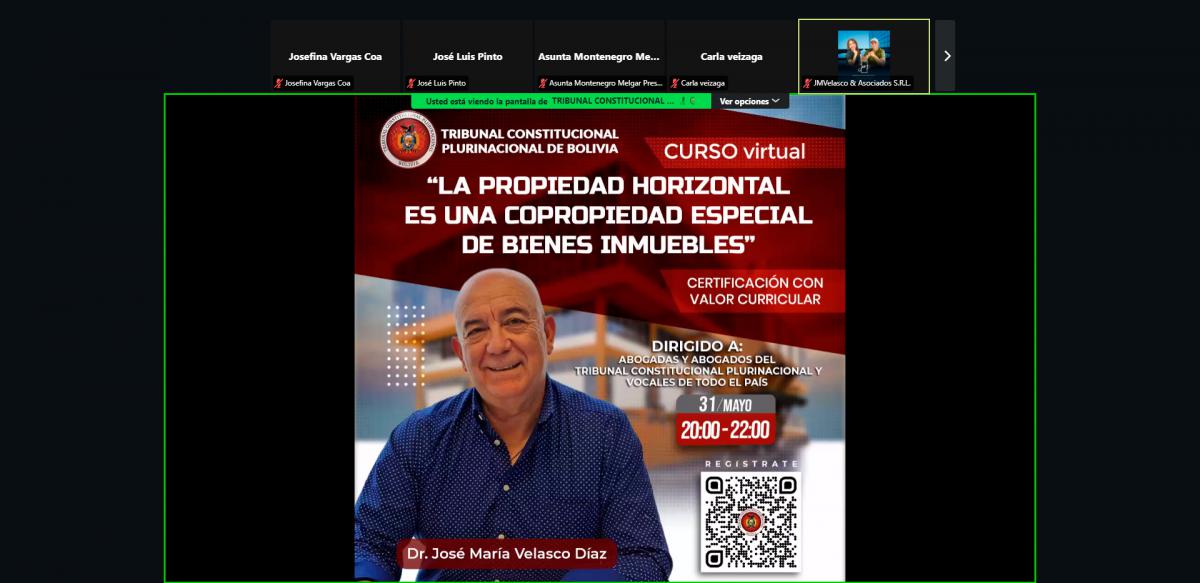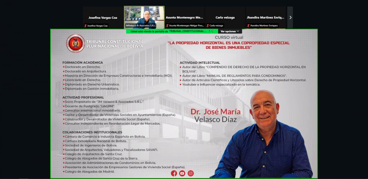 El Tribunal Constitucional Plurinacional de Bolivia (TCP), llevó adelante el quinto curso de capacitación interna sobre la “Propiedad horizontal, copropiedad especial de bienes inmuebles”, con la participación del destacado profesional de nacionalidad española, Dr. José María Velasco Díaz, docente de postgrado de la Universidad Autónoma Gabriel René Moreno, Consultor Internacional Inmobiliario y Consultor Independiente en Reordenamiento Legal de Mercados.