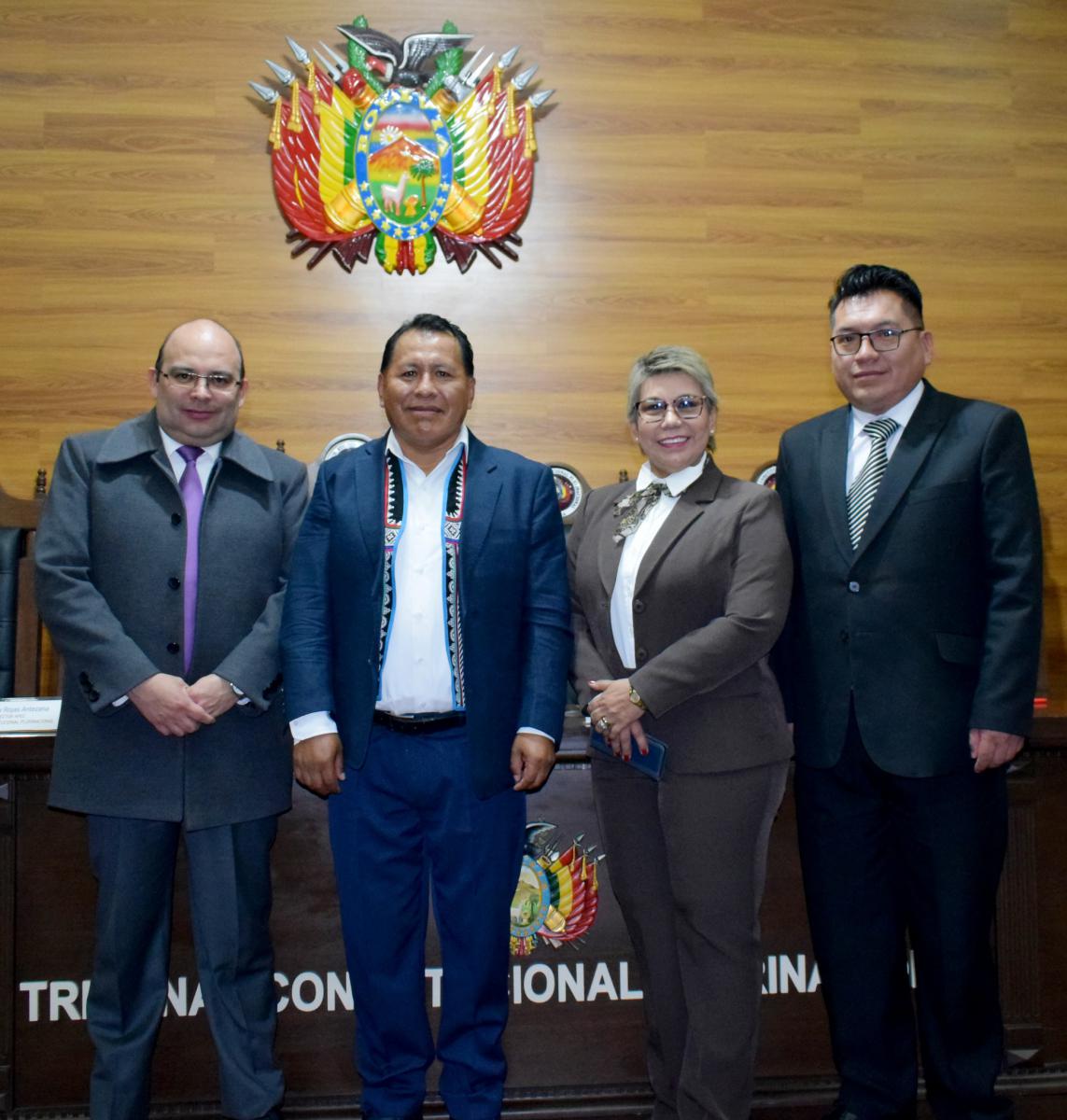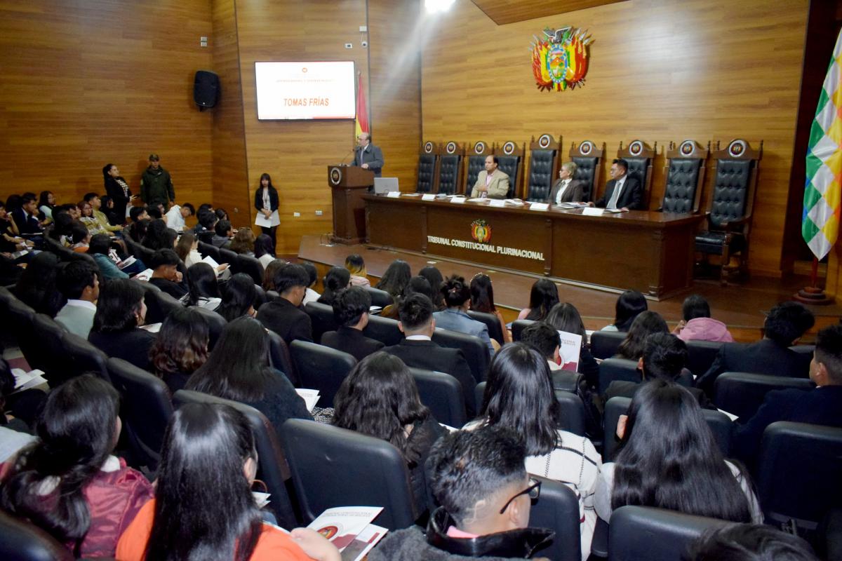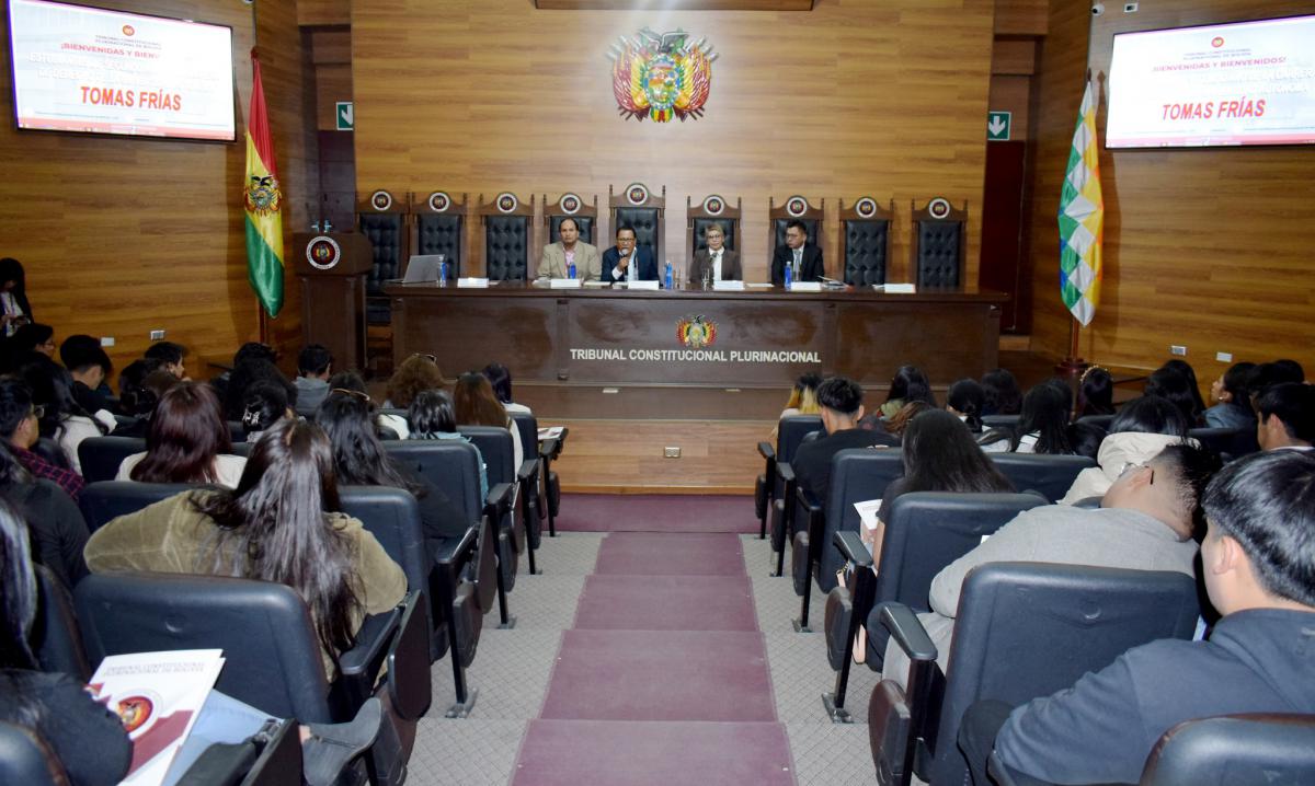 El Presidente del Tribunal Constitucional Plurinacional de Bolivia (TCP), Ph.D. Paul Enrique Franco Zamora, la Magistrada MSc. Isidora Jiménez Castro y el Magistrado, Dr. Petronilo Flores Condori, recibieron a los estudiantes del segundo año de la Carrera de Derecho de la Universidad Autónoma “Tomás Frías” en su visita académica a Sucre, sede del Sistema Judicial del país, quienes participaron en el seminario: “Procesos Constitucionales y Derechos Fundamentales”.
