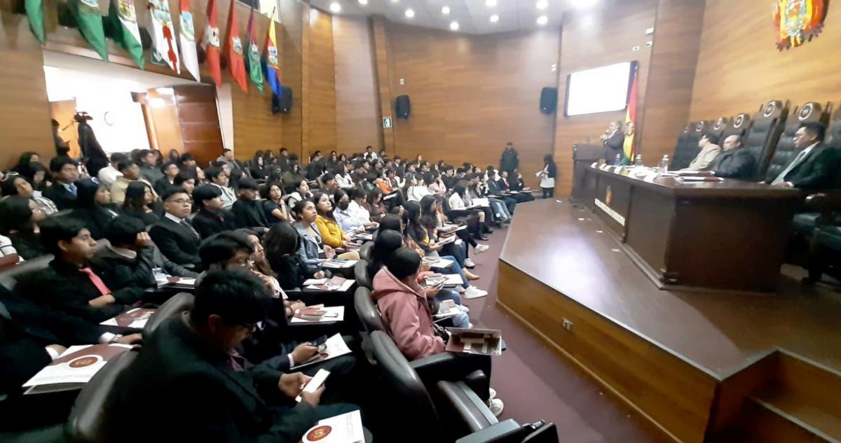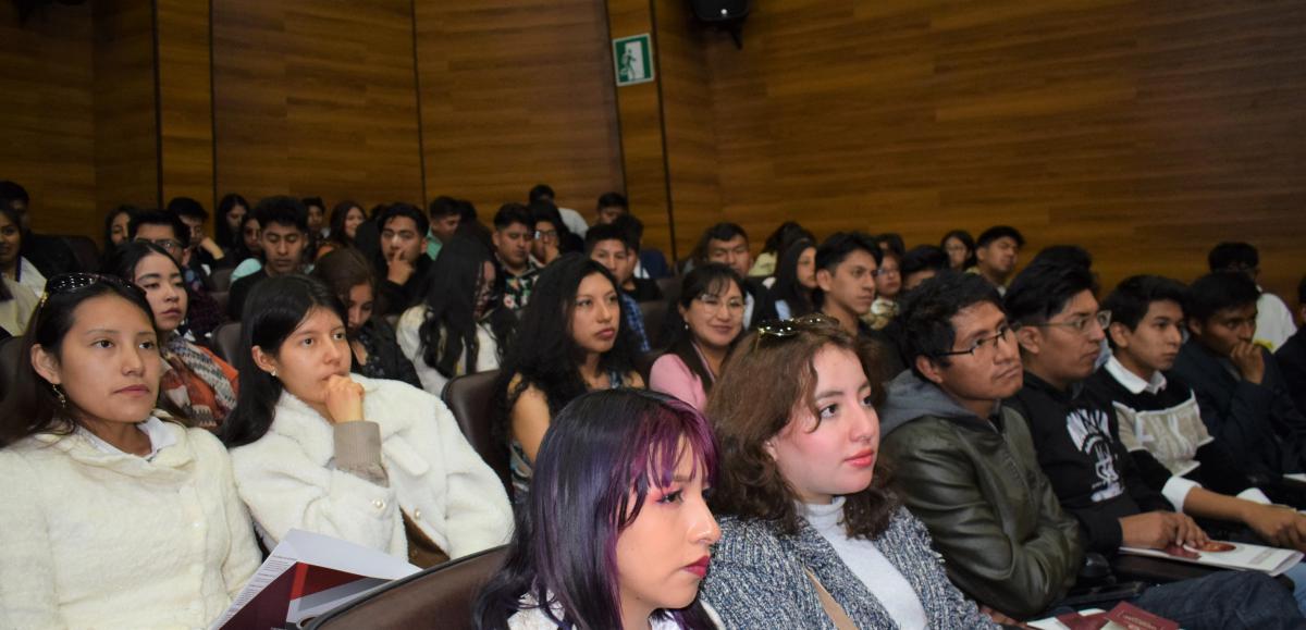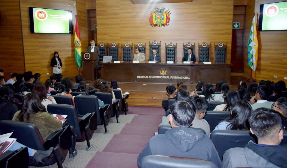 La máxima autoridad del TCP, al momento de saludar la presencia de las y los jóvenes universitarios de la ciudad de Potosí, manifestó que, el seminario realizado por la Entidad permite contribuir al proceso de formación en aula donde se imparte la teoría del Derecho, labor formativa que se complementa con el conocimiento de la práctica que emerge en el ejercicio profesional.