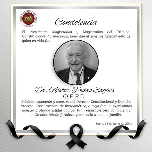 SENTIDA CONDOLENCIA Publicación de la entrada:18 de junio de 2024 Categoría de la entrada:Noticias Etiquetas: Noticias Leer más artículos Entrada anteriorTRIBUNAL CONSTITUCIONAL PLURINACIONAL REALIZÓ CONVERSATORIO DENOMINADO “DIÁLOGOS CONSTITUCIONALES” CON DESTACADOS EXPERTOS EN DERECHO CONSTITUCIONAL DE COLOMBIA, ESPAÑA Y ECUADOR Siguiente entradaSENTIDA CONDOLENCIA También podría gustarte SALUTACIÓN DE LA MAGISTRADA MSC. BRIGIDA CELIA VARGAS BARAÑADO 25 de mayo de 2024 Unidad de coordinación departamental de Oruro difunde competencias del TCP 3 de septiembre de 2018 UDABOL cede ambiente al TCP para laboratorio de investigación y gestión académica en materia constitucional 16 de noviembre de 2018