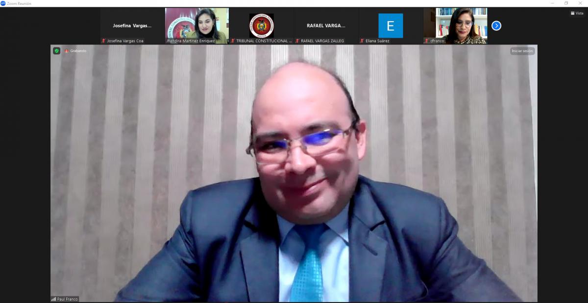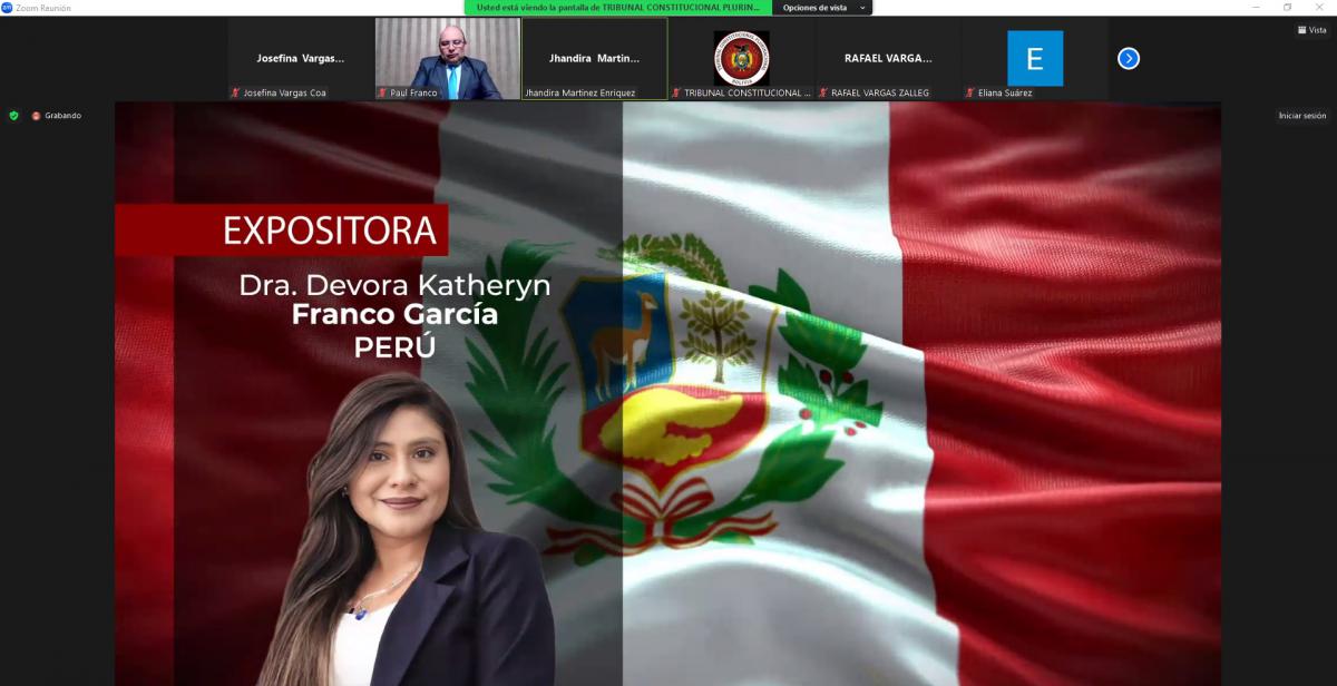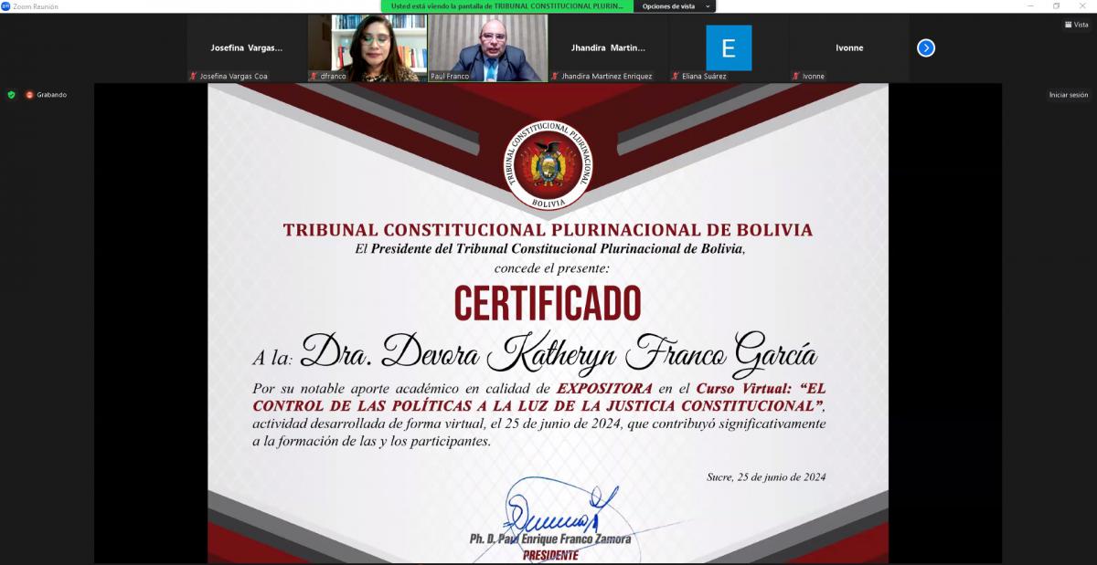 Dando continuidad al Ciclo de Actualización Jurídica interna, el Tribunal Constitucional Plurinacional de Bolivia (TCP), realizó el curso virtual: “El Control de las políticas públicas a la luz de la justicia constitucional”, con la participación de la Magíster Devora Katheryn Franco García, Miembro de la Asociación Colombiana de Derecho Procesal Constitucional, de la Red Mundial de Justicia Constitucional y de la Academia Jurídica Defendiendo la Libertad.