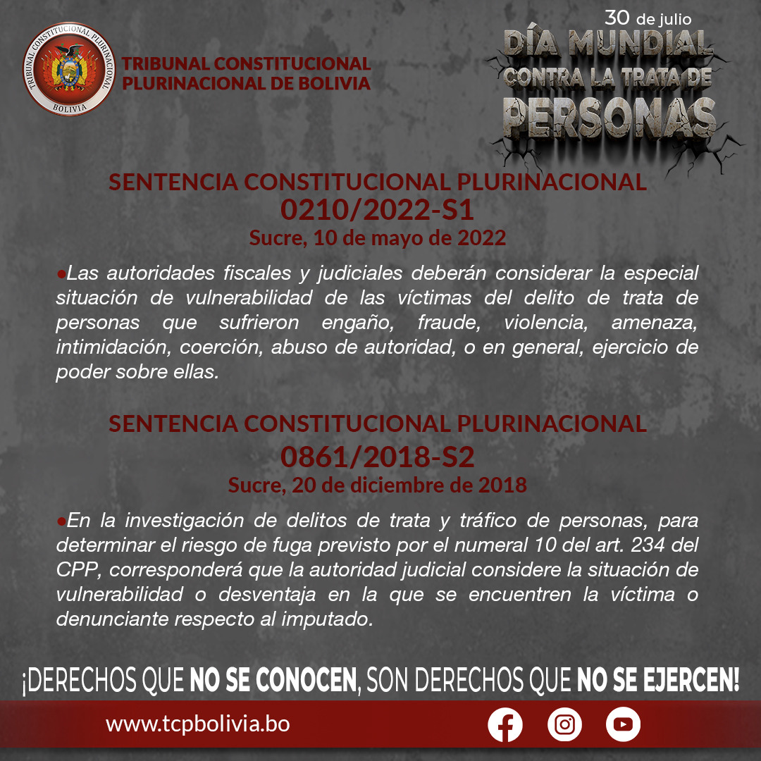 Desde el Tribunal Constitucional Plurinacional de Bolivia (TCP) damos a conocer las Sentencias Constitucionales Plurinacionales, que protegen los derechos de las personas víctimas de tráfico humano.