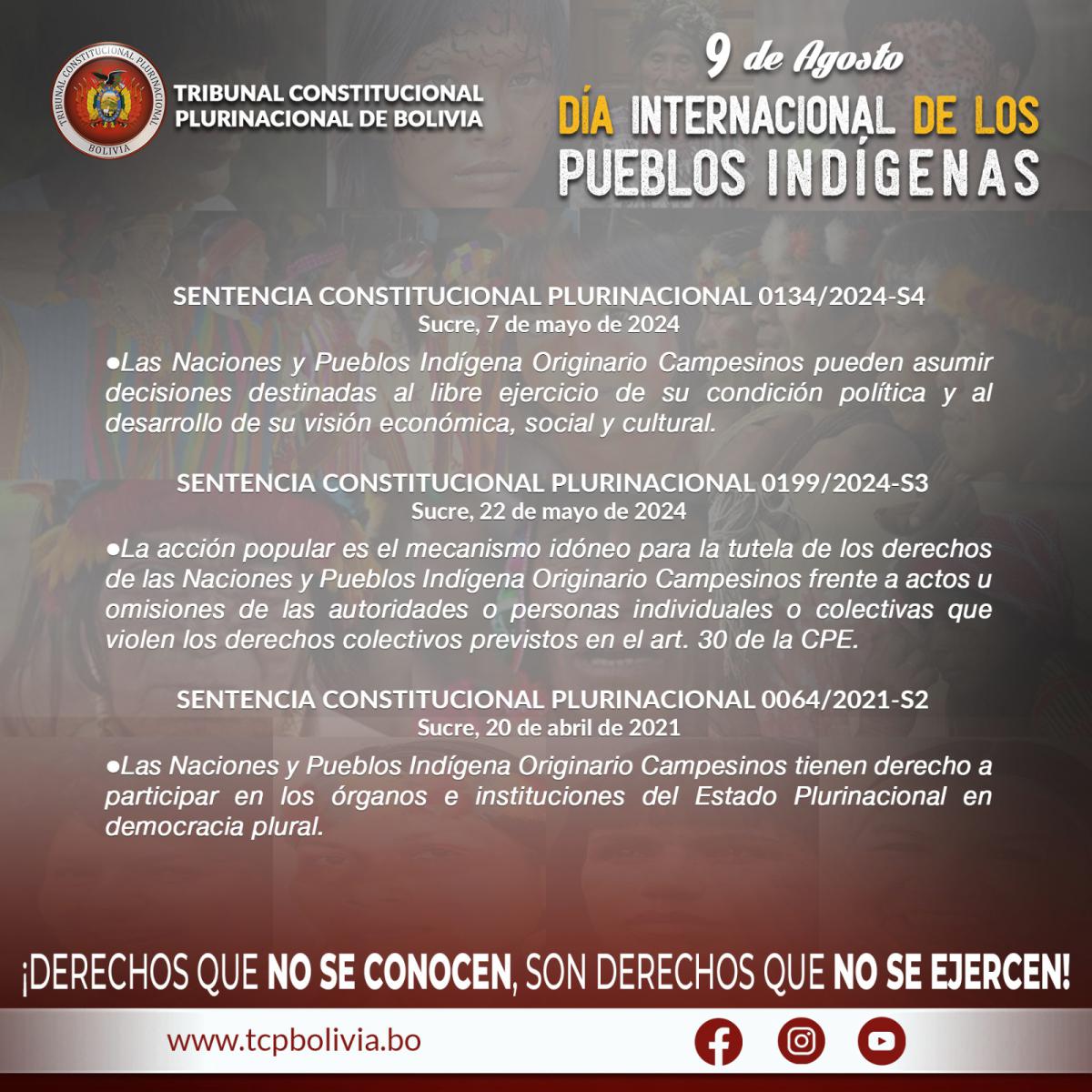 En el Día Internacional de los Pueblos Indígenas compartimos las Sentencias Constitucionales Plurinacionales emitidas por el Tribunal Constitucional Plurinacional de Bolivia (TCP) que protegen los derechos de las Naciones y Pueblos Indígena Originario Campesinos de Bolivia.