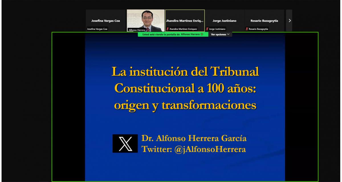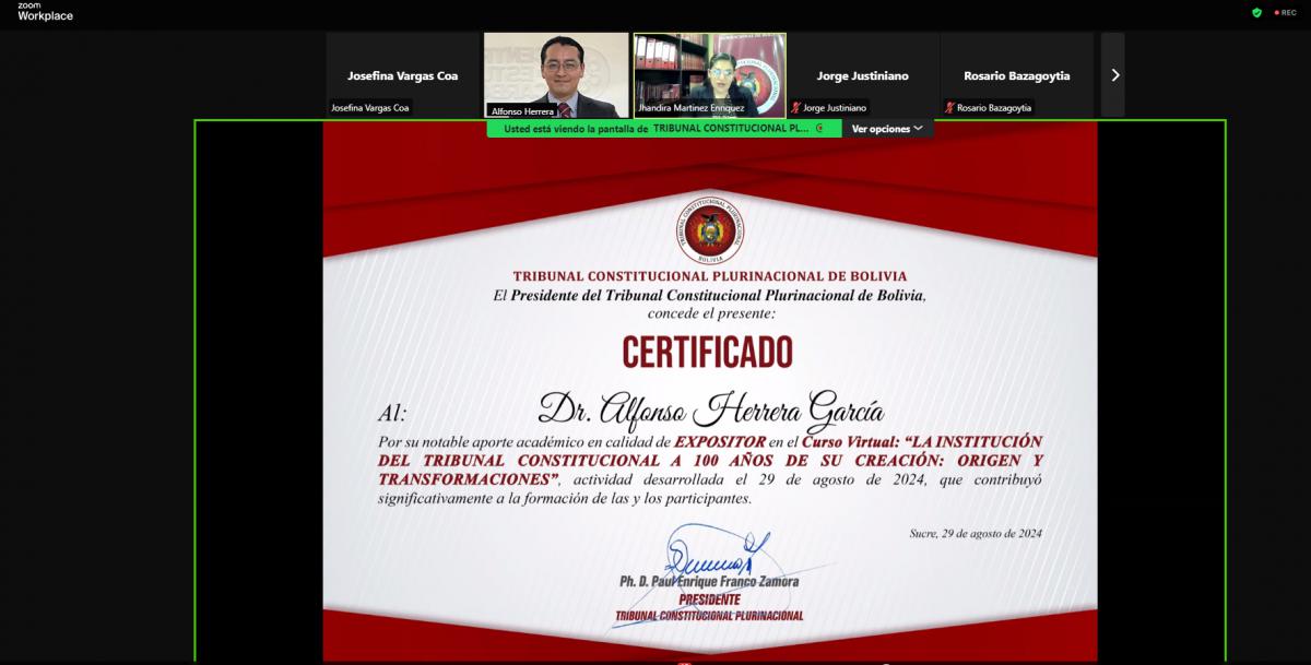 Con la participación del Doctor en Derecho y Especialista en Derecho Constitucional y Ciencia Política, Alfonso Herrera García (México), el Tribunal Constitucional Plurinacional (TCP), realizó el curso virtual de capacitación interna, “La institución del Tribunal Constitucional a 100 años de su creación: Origen y Transformaciones”, dirigido a su personal y a los Vocales Constitucionales del país.