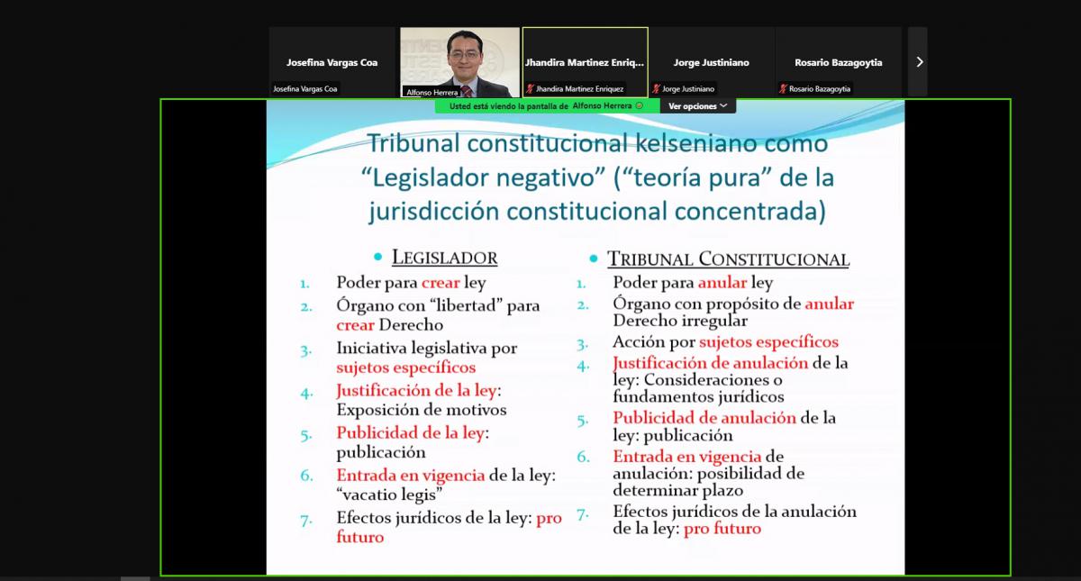 En este espacio académico, el Dr. Alfonso Herrera promovió la reflexión sobre los antecedentes temporales, procesales, positivos, convencionales y principales aportes jurisprudenciales en el ejercicio de la jurisdicción constitucional desde la creación del primer Tribunal Constitucional.