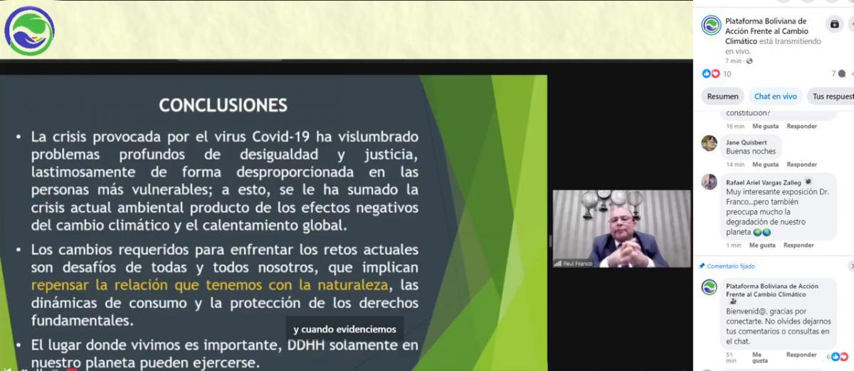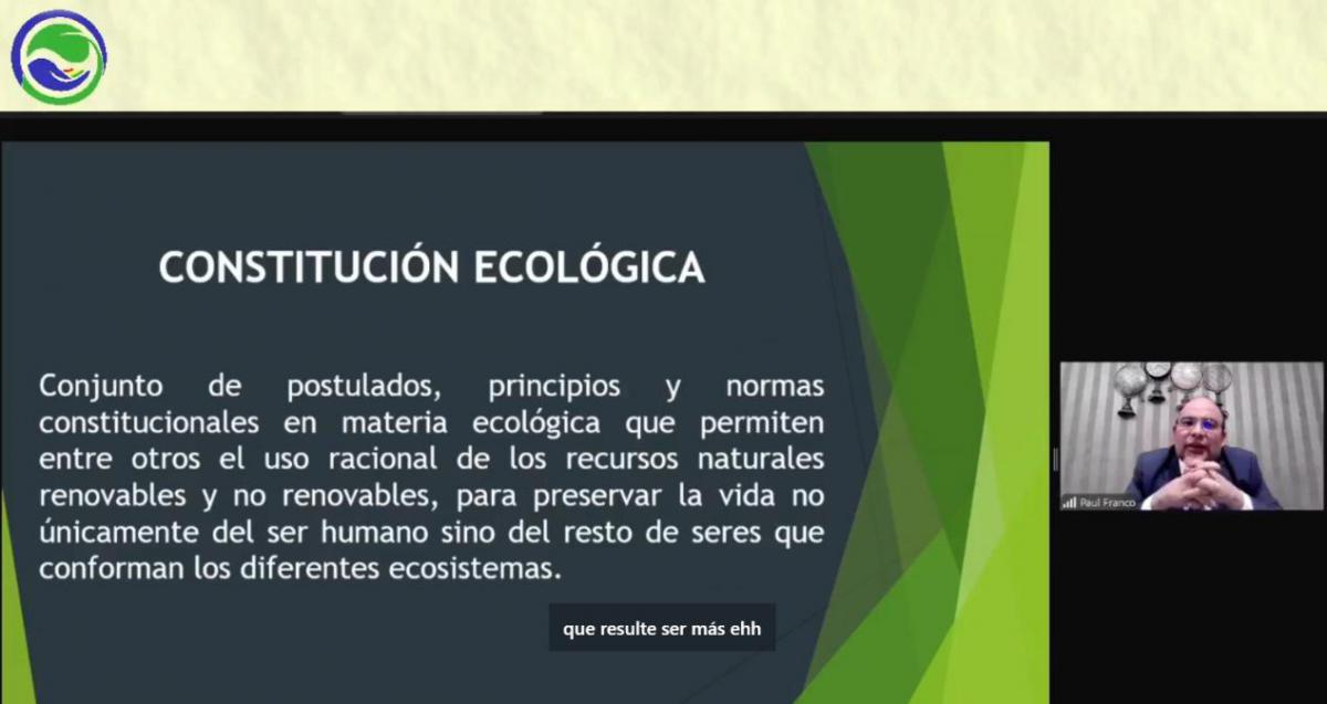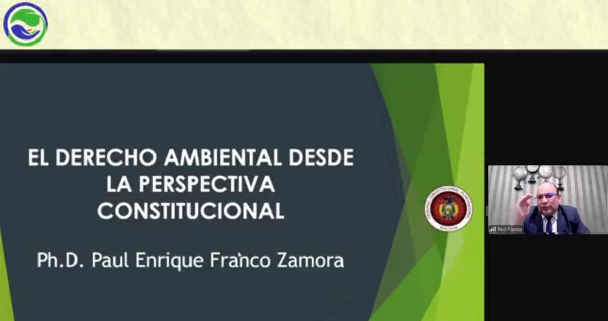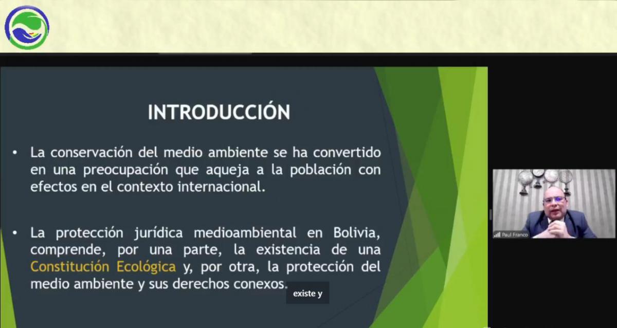 El Dr. Franco Zamora, indicó además que “la protección jurídica medioambiental en Bolivia, comprende, por una parte, la existencia de una Constitución Ecológica y, por otra, la protección del medio ambiente y sus derechos conexos. A partir de estos principales elementos del Derecho Constitucional, es posible debatir y reflexionar temas relacionados al cambio climático, contaminación, deforestación, escasez de agua, degradación del suelo y extinción de especies o pérdida de la biodiversidad, que inciden en el bienestar de las futuras generaciones”, manifestó la autoridad.