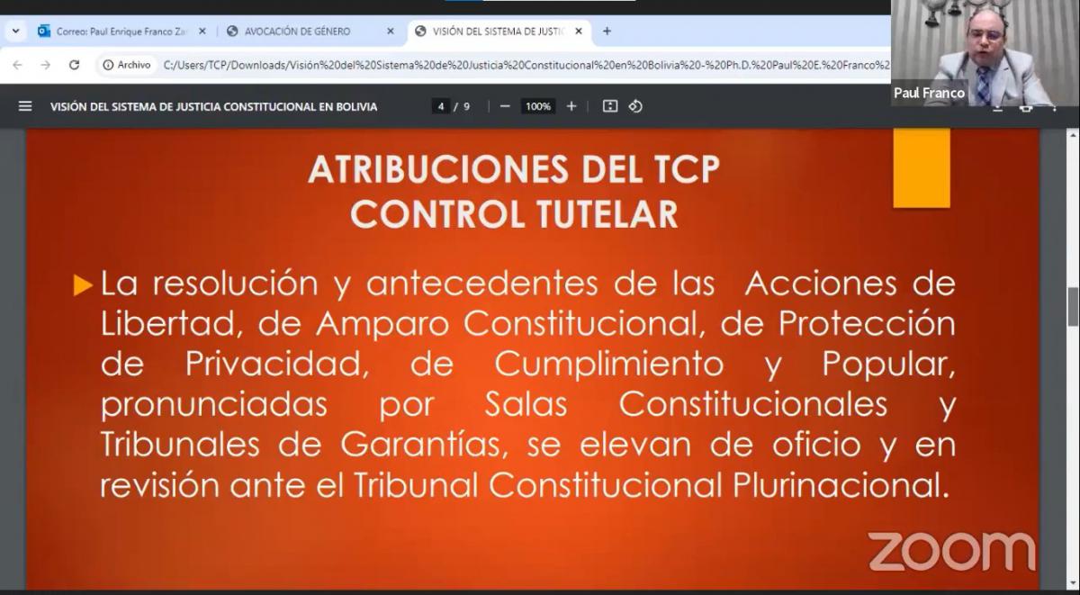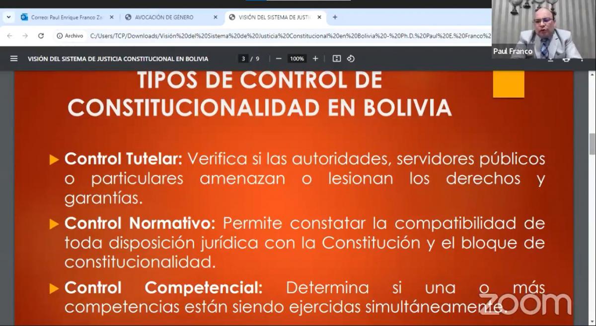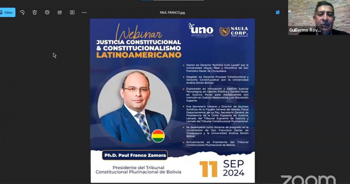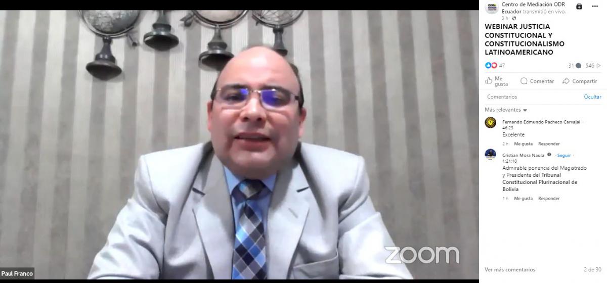El Presidente del Tribunal Constitucional Plurinacional de Bolivia (TCP), Ph.D. Paul Enrique Franco Zamora, participó como ponente en el Webinar: “Justicia Constitucional & Constitucionalismo Latinoamericano”, a invitación de la Fundación Online Dispute Resolution Ecuador (ODR-E) y del Centro de Estudios Jurídicos NAULA CORP S.A.S.