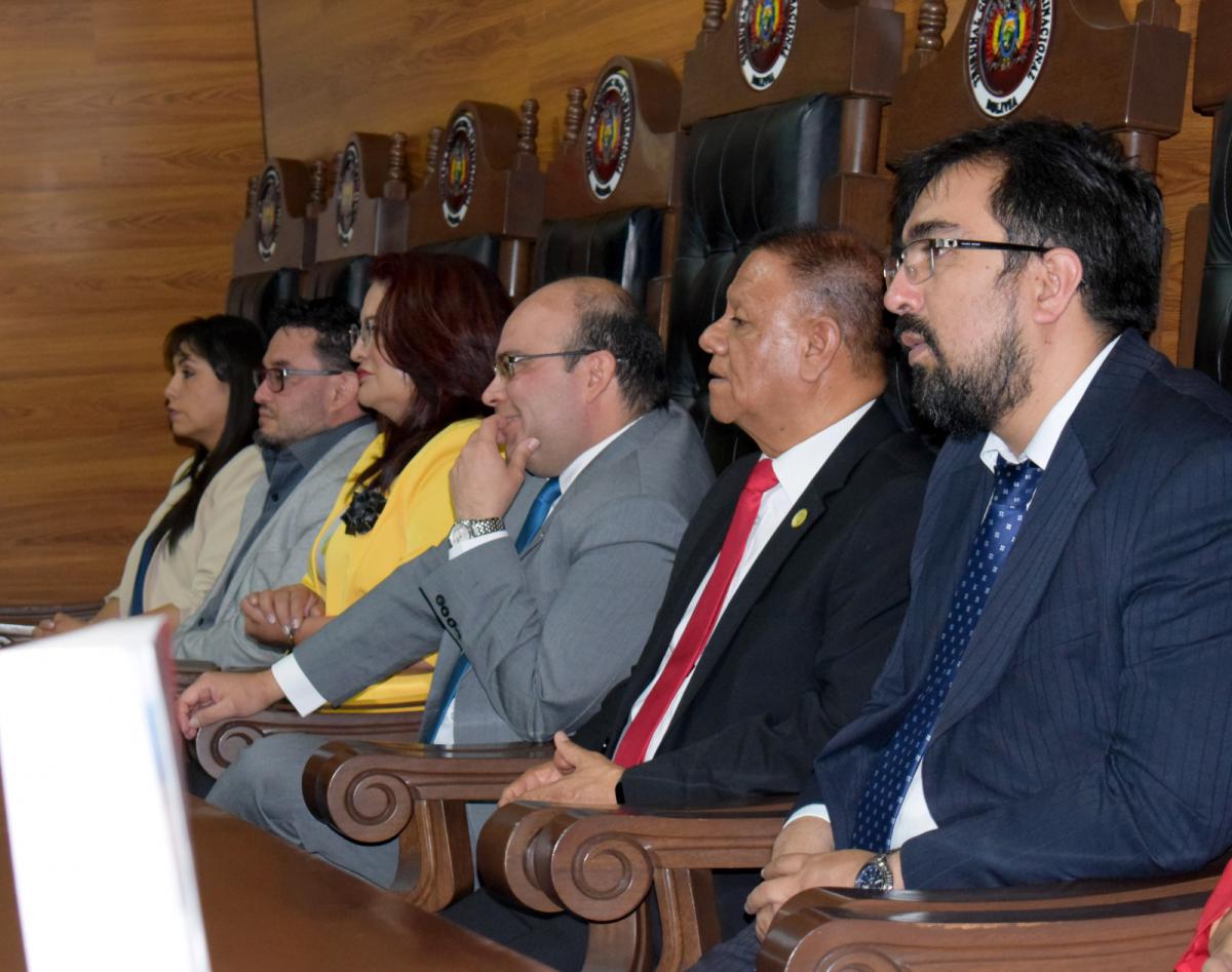 Participaron también del acto de presentación de la “Revista Semillero”, la Magistrada del TCP, MSc. Karem Lorena Gallardo Sejas; el Vicerrector de la Universidad Privada del Valle (Univalle Sede – Sucre), Lic. MBA Carlos Luis Torricos Mérida; el Director de la Carrera de Derecho de la Universidad Mayor, Real y Pontificia de San Francisco Xavier de Chuquisaca, MSc. Freddy Magariños Egües; el Director de la Carrera de Derecho de Univalle, MSc. Fernando Fernández Ponce de León; la Dra. Diana Marcela Peña Cuellar, Tutora y Subdirectora de la “Revista Semillero” Sección Colombia (virtual) y el Dr. Juan Alberto Castañeda Méndez, Tutor y Subdirector de la “Revista Semillero” Sección Perú (virtual).