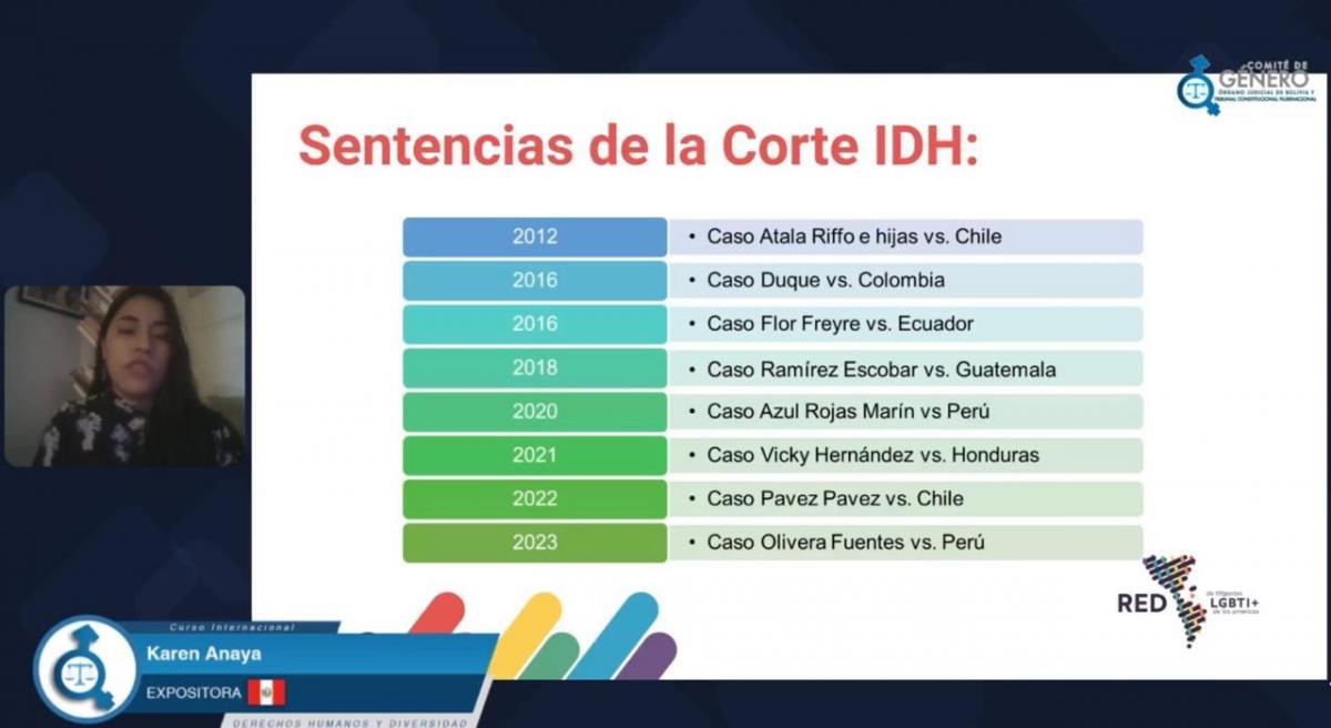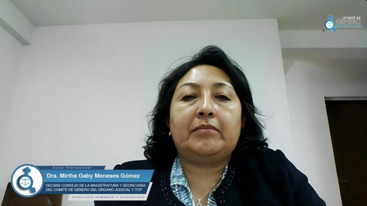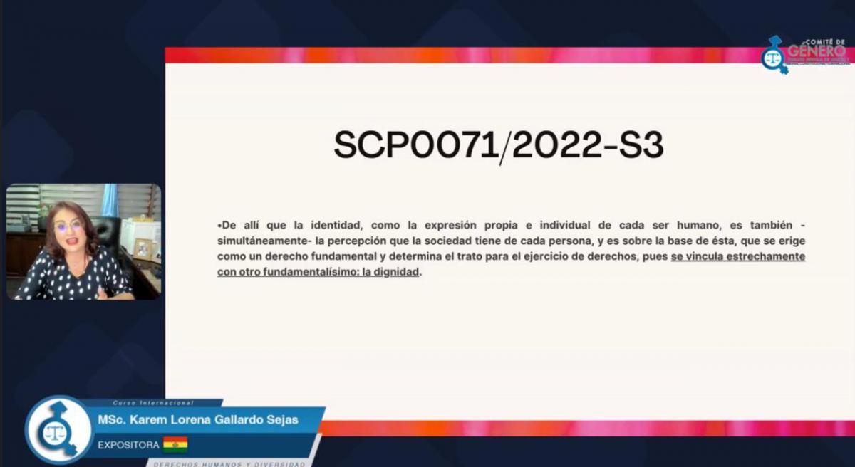 Durante su intervención, la Presidenta del Comité de Género y Magistrada del TCP, MSc. Karem Lorena Gallardo, manifestó que, “a partir del Curso, corresponde reflejar lo que ocurre en la práctica ante la creciente evidencia de inseguridad y discriminación en todas sus dimensiones y grado de vulnerabilidad al que se ven sometidos y sometidas las y los integrantes de este colectivo, y la respuesta otorgada desde el máximo órgano de resguardo constitucional que busca efectivizar el reconocimiento de sus derechos como seres humanos, a través de dos componentes esenciales como son la igualdad y la no discriminación”.