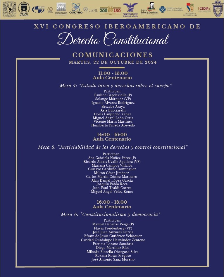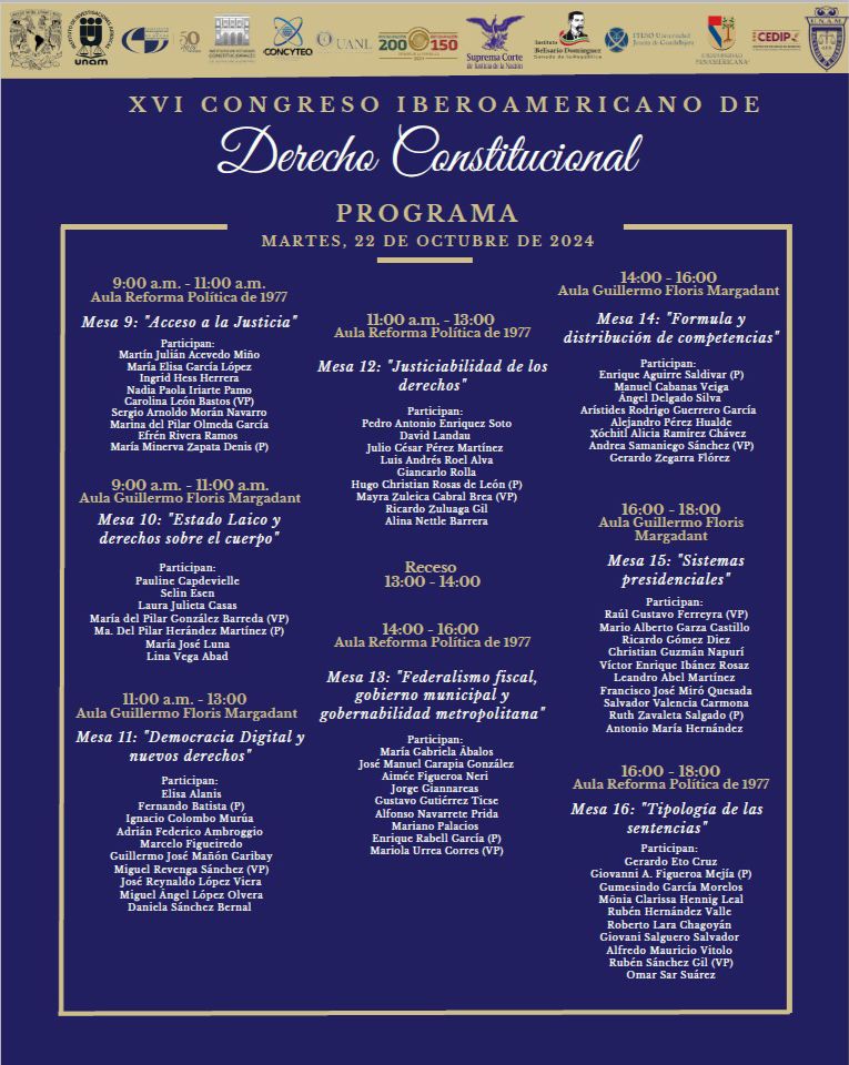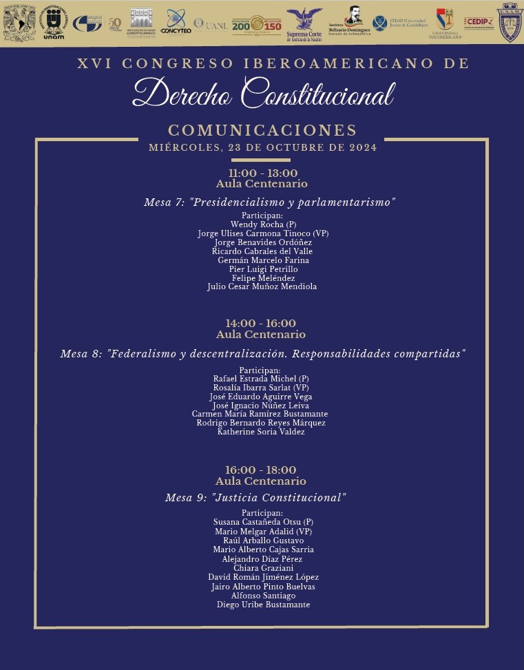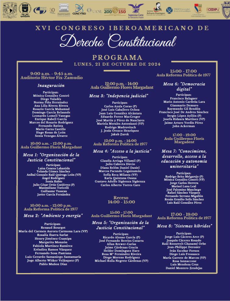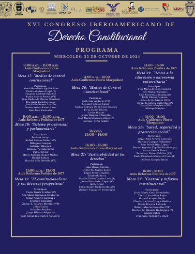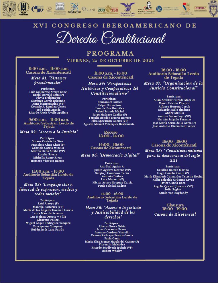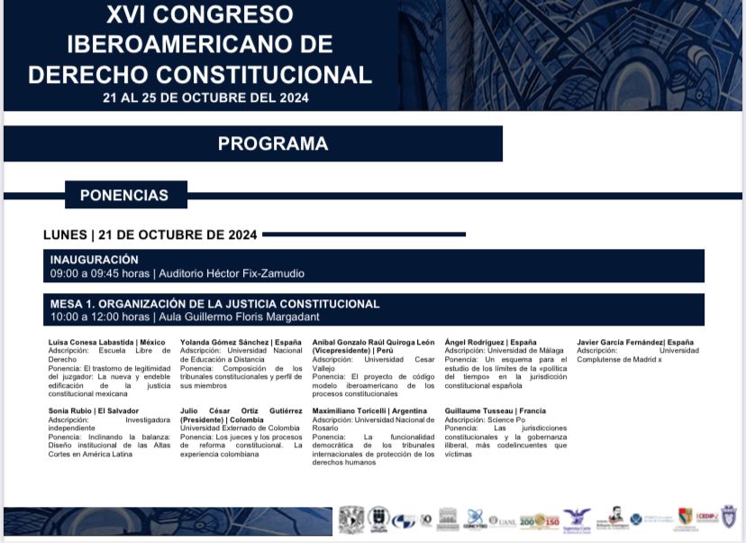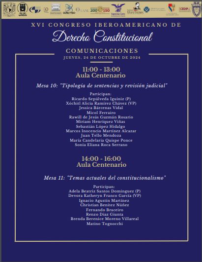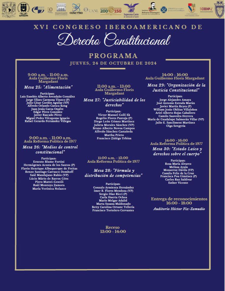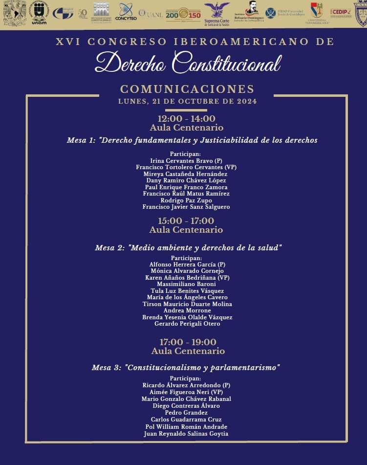 Tenemos el agrado de compartir la invitación del Instituto de Investigación Jurídicas de la Universidad Nacional Autónoma de Investigaciones Jurídicas de la Universidad Nacional Autónoma de México (UNAM), para participar en la XVI edición del Congreso Iberoamericano de Derecho Constitucional “El constitucionalismo para la democracia del siglo XXI”, evento académico donde participará como docente expositor el Presidente del Tribunal Constitucional Plurinacional de Bolivia – TCP, Ph.D. Paul Enrique Franco Zamora, el día lunes 21 de octubre de 2024 en la Mesa 1: “Derechos Fundamentales y Justiciabilidad de los Derechos”, con la ponencia titulada: “La Exigibilidad y justiciabilidad de derechos de cuarta generación ante tribunales locales o supraestatales”, de 14:00 a 16:00 hora boliviana.