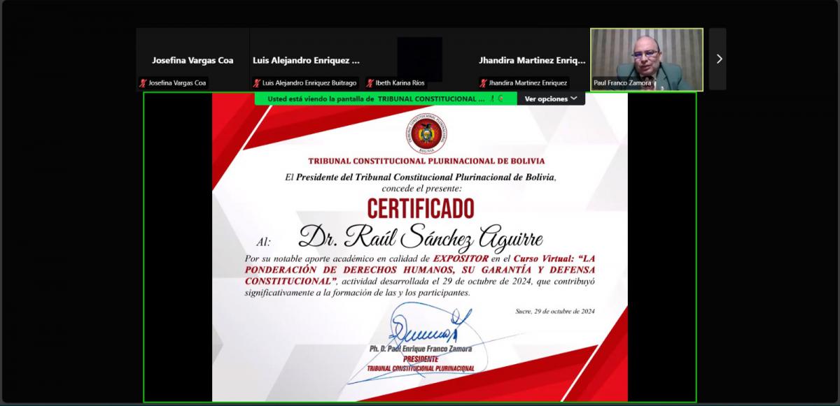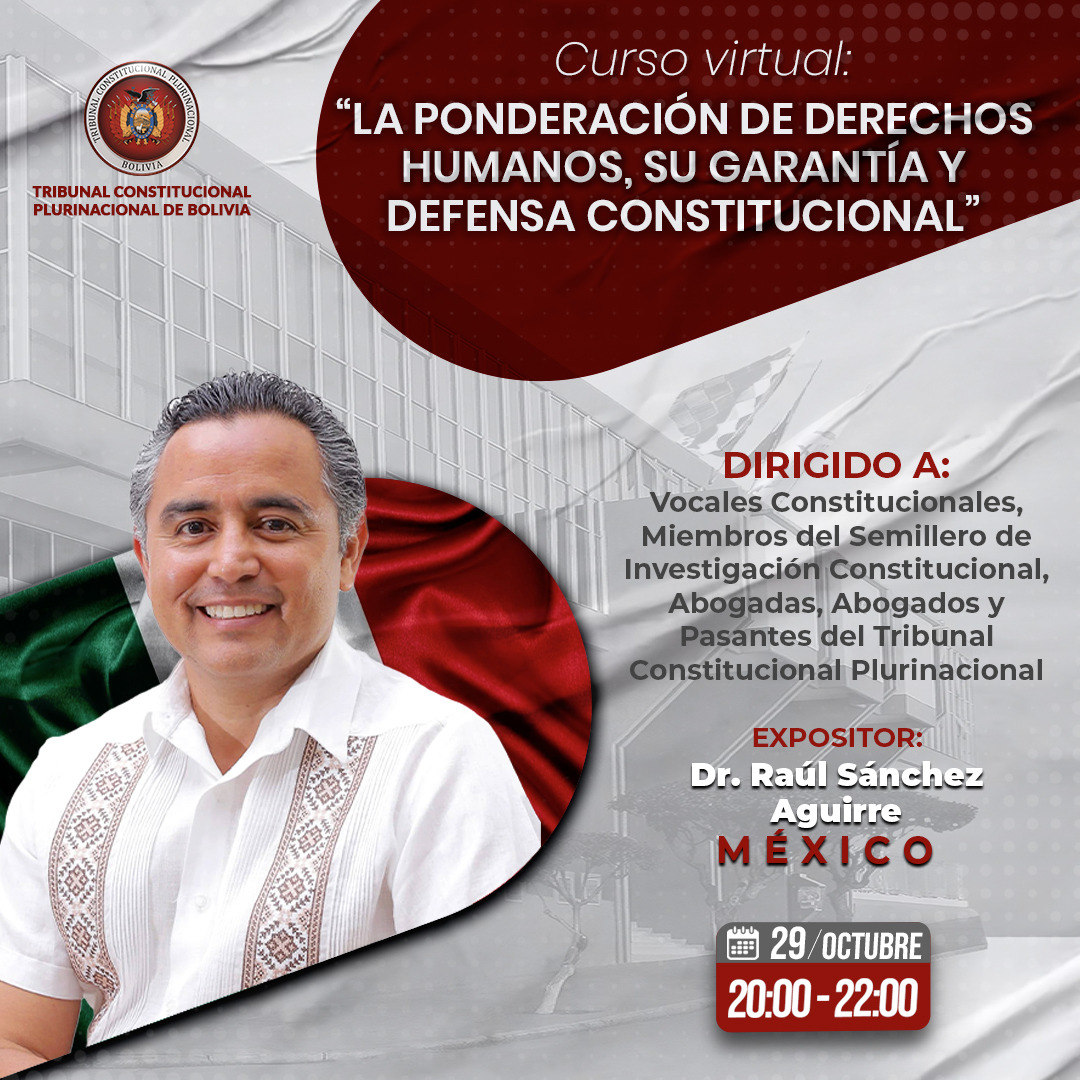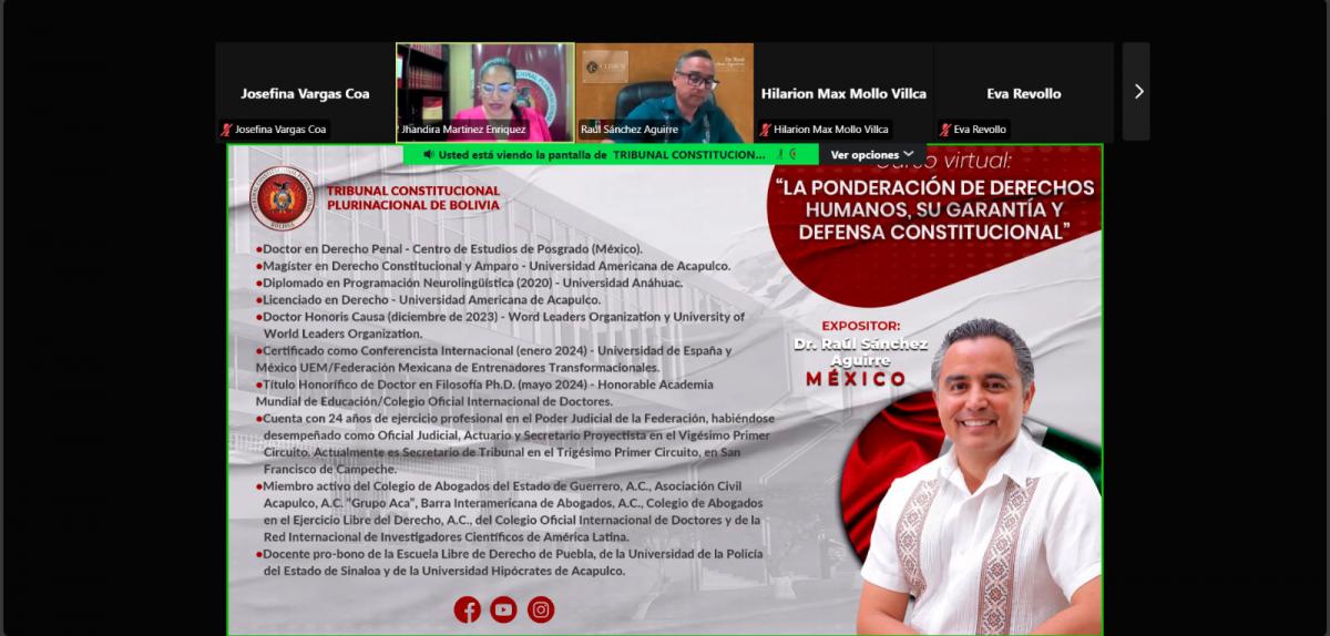 El Tribunal Constitucional Plurinacional de Bolivia (TCP), desarrolló en el Aula Virtual de la Academia Plurinacional de Estudios Constitucionales (APEC) el curso denominado: “La Ponderación de Derechos Humanos, su garantía y defensa constitucional», impartido por el reconocido Dr. Raúl Sánchez Aguirre, Secretario de Tribunal en el Trigésimo Primer Circuito en San Francisco de Campeche – México y Miembro Activo de la Red Internacional de Investigadores Científicos de América Latina.