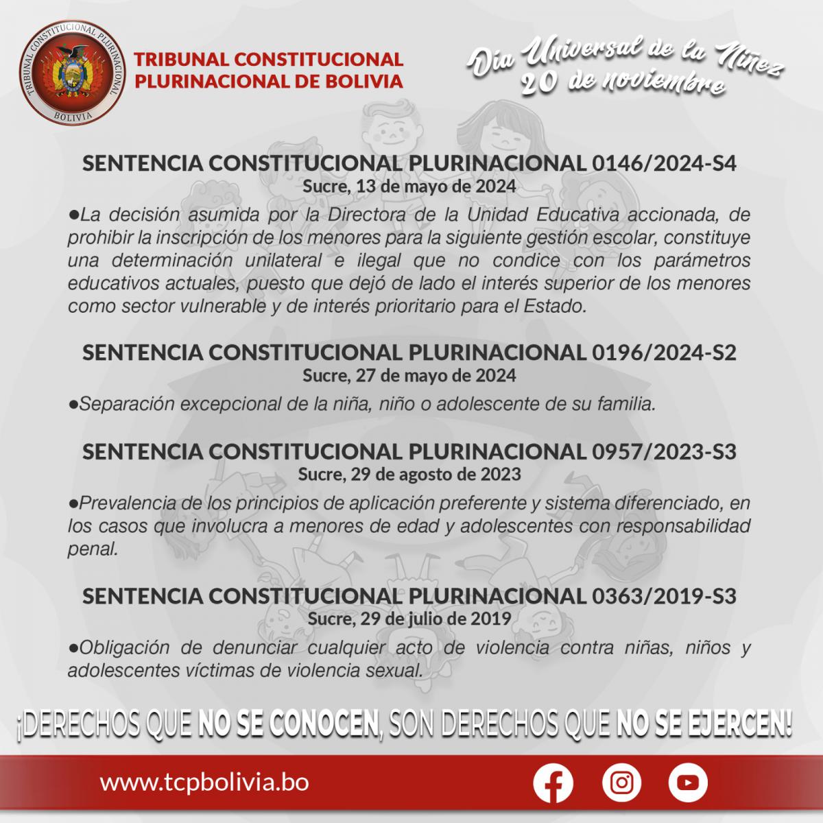 En el Día Mundial de la Niñez, desde el Tribunal Constitucional Plurinacionales de Bolivia (TCP), compartimos las Sentencias Constitucionales Plurinacionales emitidas en resguardo de los derechos de este sector vulnerable y de interés prioritario para el Estado.